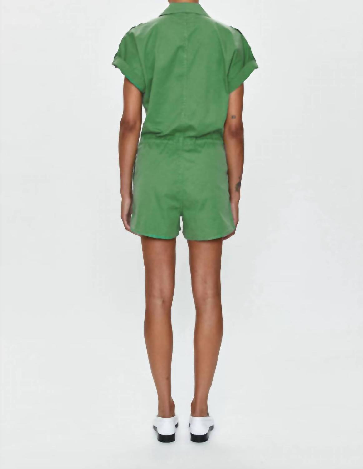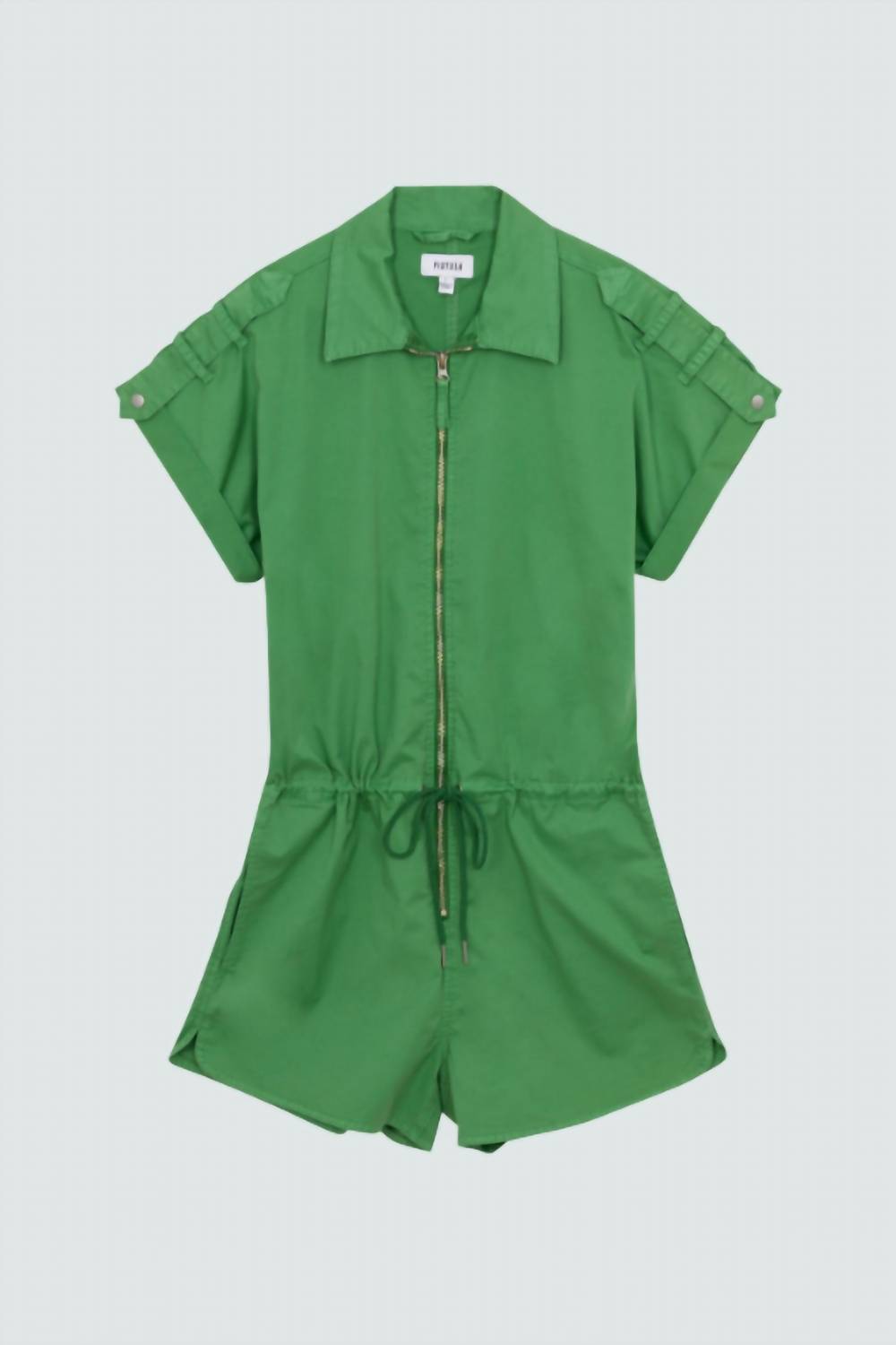 It doesn't take much for this one piece to look effortlessly cool. Add some statement jewelry to dress it up, or throw on some sneakers for a more casual vibe. Short sleeved field suit with zippered front closure and adjustable drawstring waist. Decorated with shoulder epaulettes and a collared neckline, crafted from a lightweight fabrication with a touch of stretch. Fabric: 98% Cotton 2% Spandex. Wash cold. Model is 5’9” wearing size Small - Inseam: 2 1/2", Leg Opening 28".