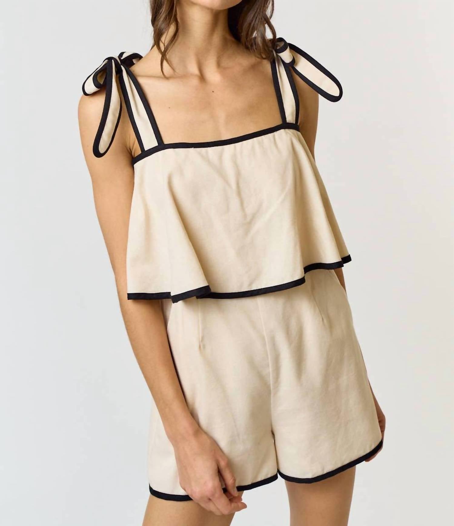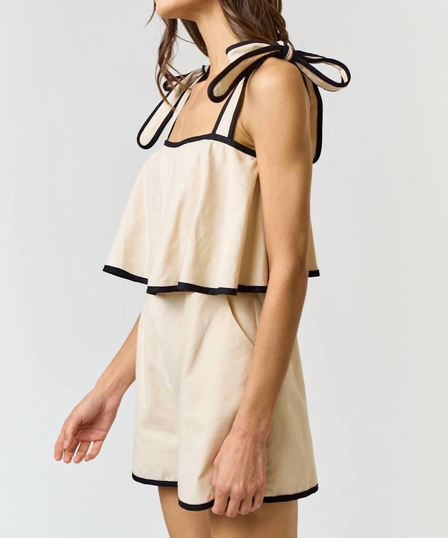 The perfect outfit choice when you you need something quick to throw on and still want to look efforlessly cool. Elevate your holiday party look with the Contrast Trim Romper by Lalavon, a chic blend of style and practicality in oatmeal and black. This romper is crafted from a cotton blend, featuring 70% cotton and 30% linen, for a breathable, relaxed fit. It boasts shoulder ties, a ruffled design, and functional pockets, secured with an invisible back zip closure. Perfect for spring occasions, this piece channels minimalist elegance for the ultimate cool-girl vibe, though specific care instructions are not provided.