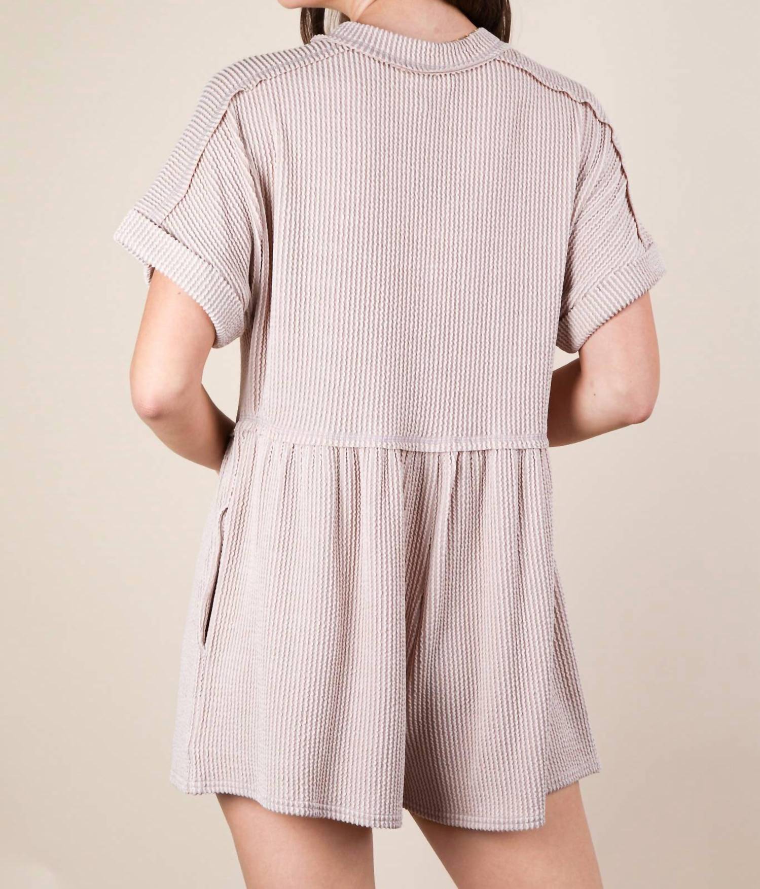 The perfect outfit choice when you you need something quick to throw on and still want to look efforlessly cool. The Two Tone Ribbed Knit Comfy Casual Romper by VERY J, crafted for women in a soothing oatmeal hue, delivers a perfect blend of comfort and style. Featuring short dolman sleeves and a relaxed fit, this romper highlights a V-neckline and practical side pockets for added convenience. Made from an 85% polyester, 12% rayon, and 3% spandex blend, it ensures softness and stretch. Closure: Button closure. Perfect for vacation and embodying a Y2k trend, this versatile piece is ideal for summer outings. Model height: 5'8", wearing a Small.