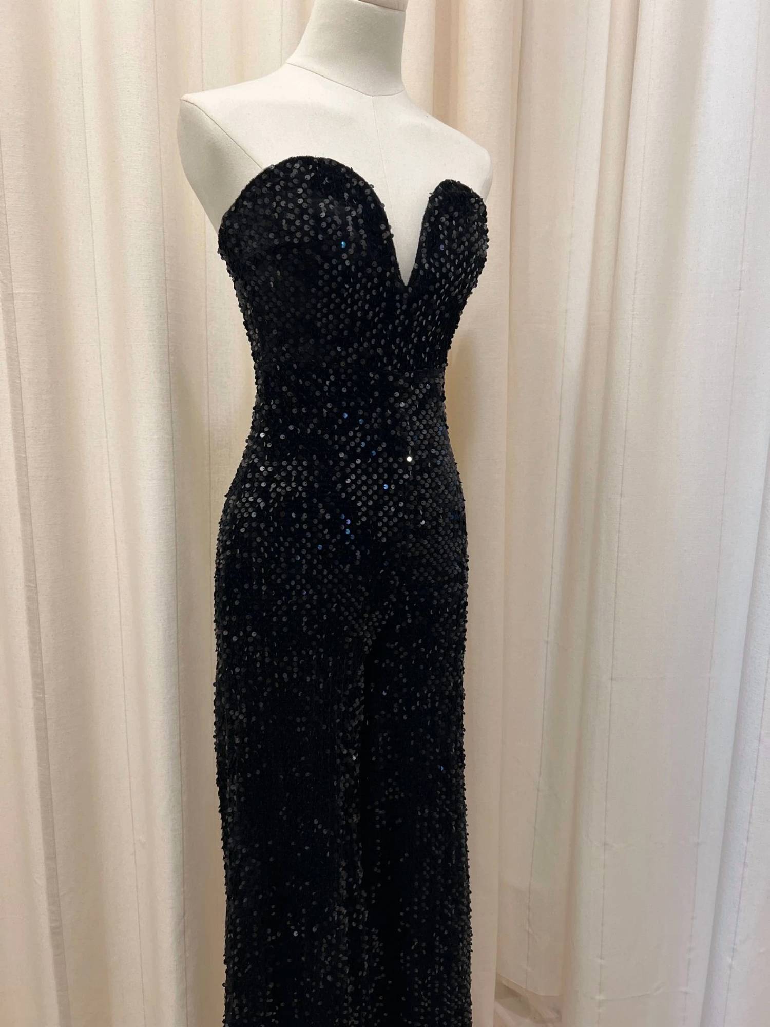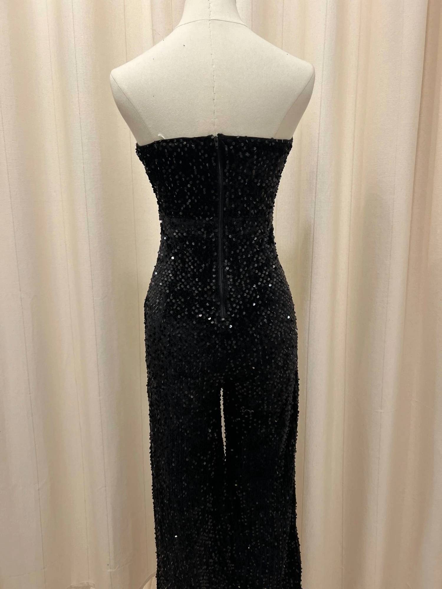 It doesn't take much for this one piece to look effortlessly cool. Add some statement jewelry to dress it up, or throw on some sneakers for a more casual vibe. Elevate your evening look with the Sequined Velvet Strapless Jumpsuit by HYFVE, the epitome of quiet luxury in sophisticated black. Crafted from luxurious velvet, this women's jumpsuit exudes elegance with its textured pattern, perfect for dinner parties and New Year's Eve celebrations. Featuring a convenient zip closure for a sleek silhouette, this piece ensures you're the center of attention. Ideal for the winter season, this jumpsuit embodies timeless style without the fuss of pockets.