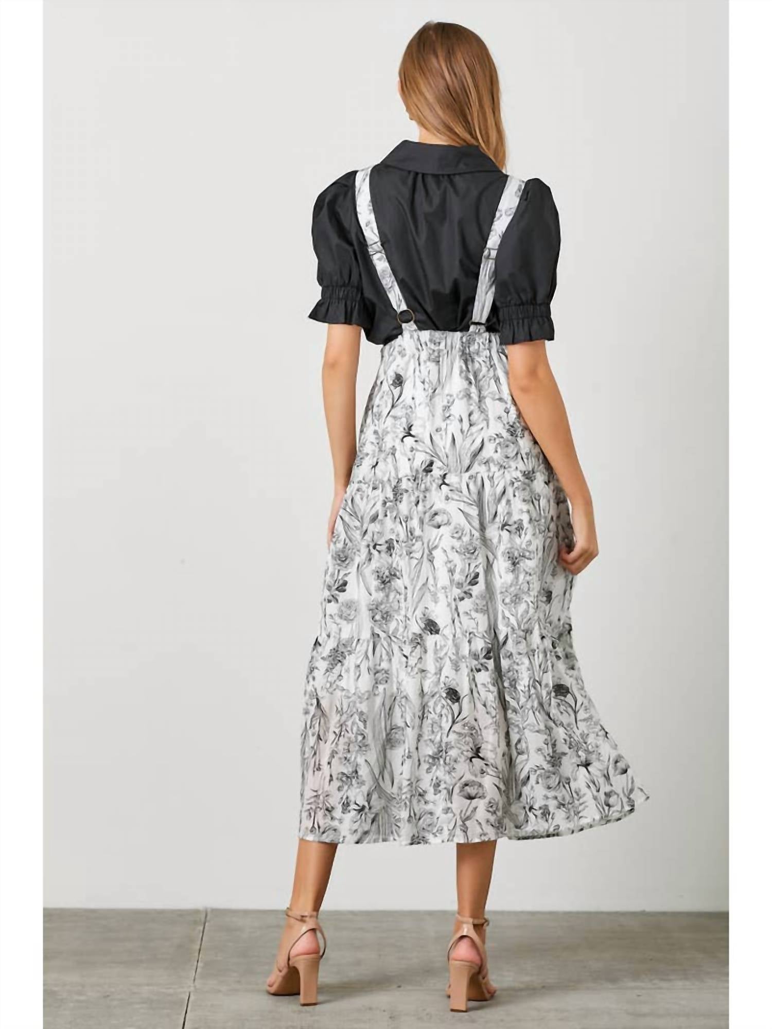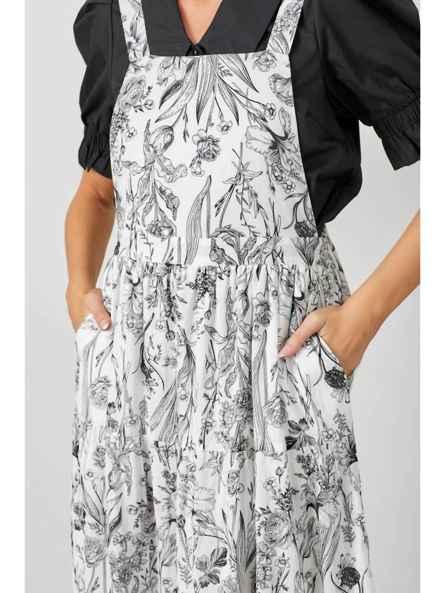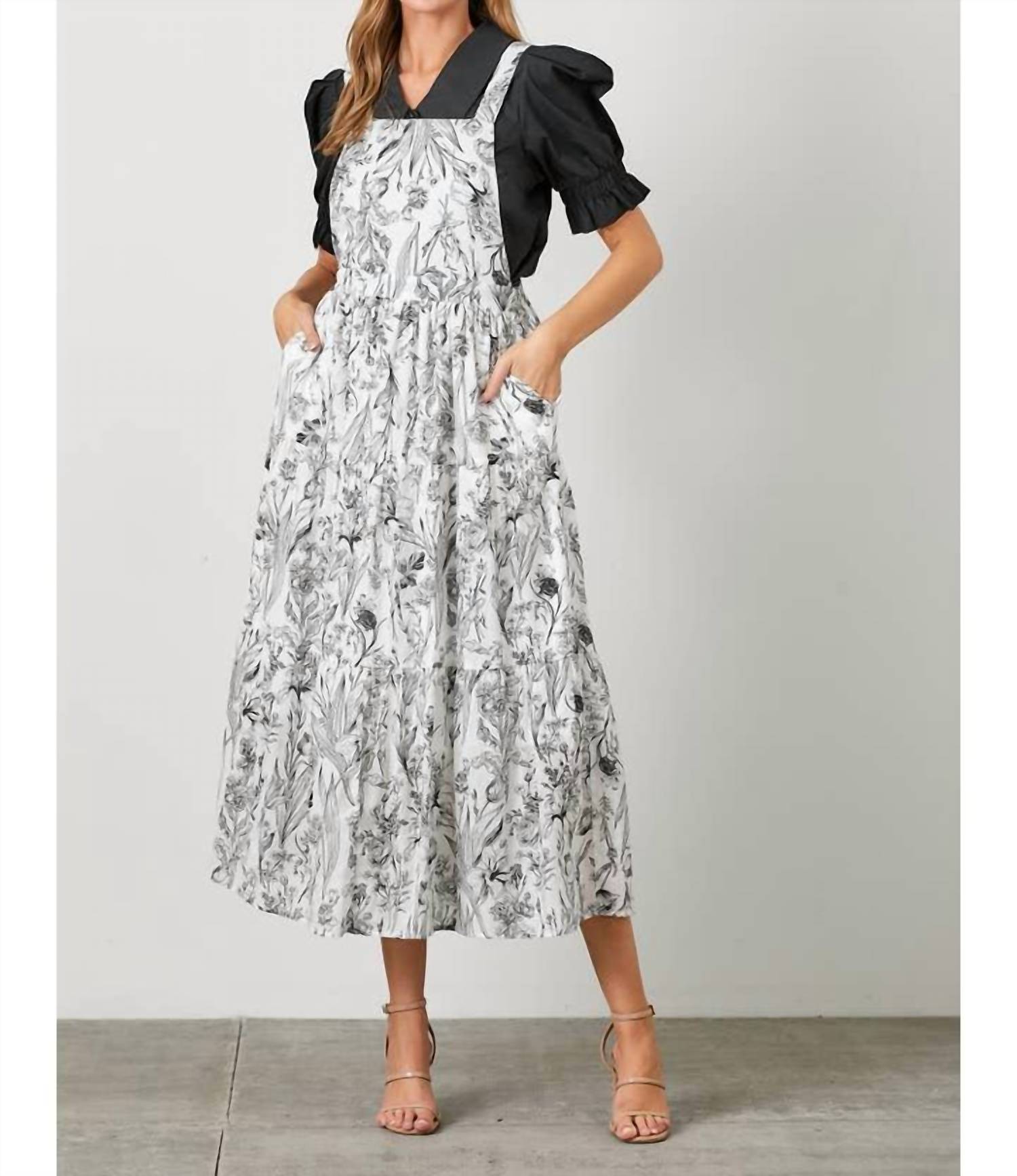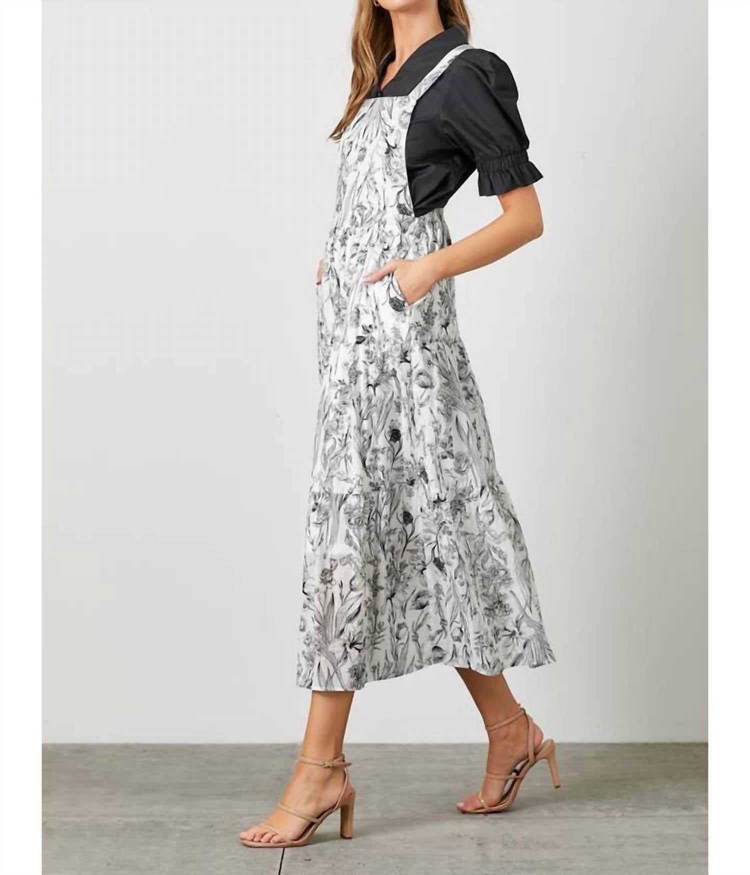 The perfect outfit choice when you you need something quick to throw on and still want to look efforlessly cool. Meet the Caplan Midi Jumper by Polagram, designed for playful elegance in a boho chic style. This jumper features long adjustable straps and a tiered midi-length skirt, crafted from a comfortable blend of 60% cotton and 40% polyester. It comes in white with delicate black floral details, and is fully lined for added comfort, complete with side seam pockets for practicality. Closure: Pull-on style. Care: Machine wash cold, hang dry, do not bleach. Available in sizes S (46" length, 24" waist) to 3X (47" length, 39" waist), accommodating both standard and plus sizes. Ideal for spring outings or Easter celebrations.