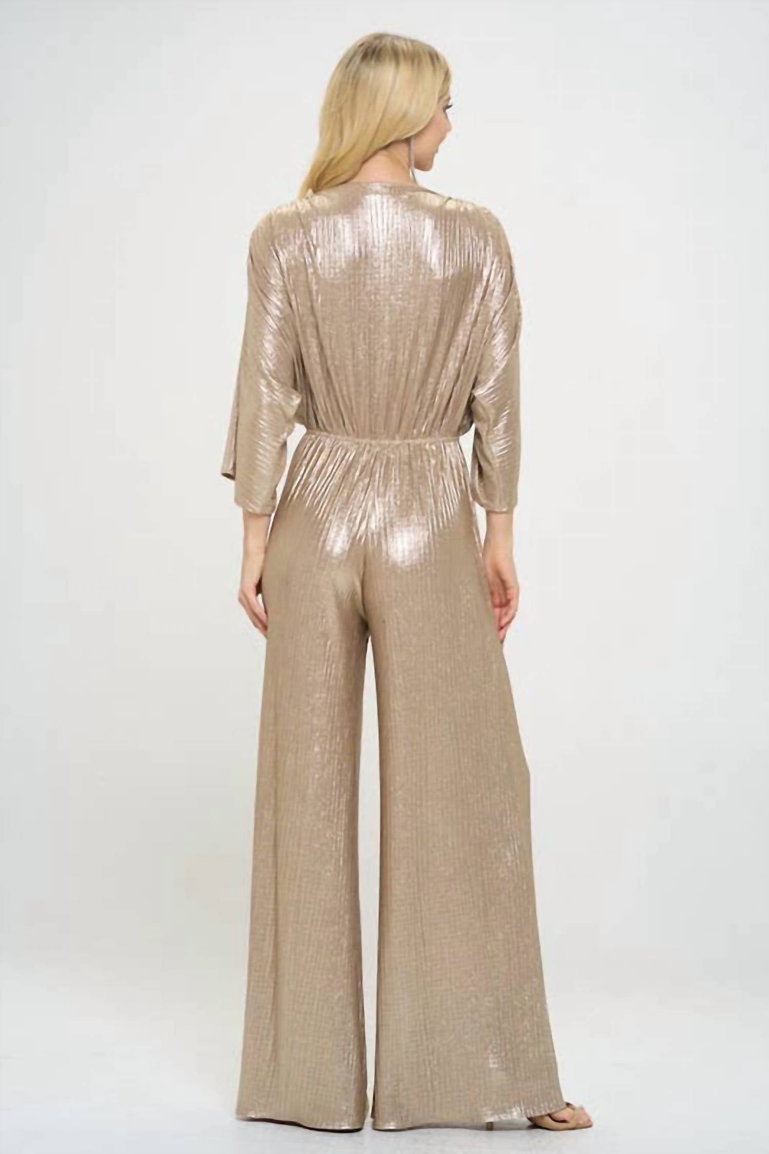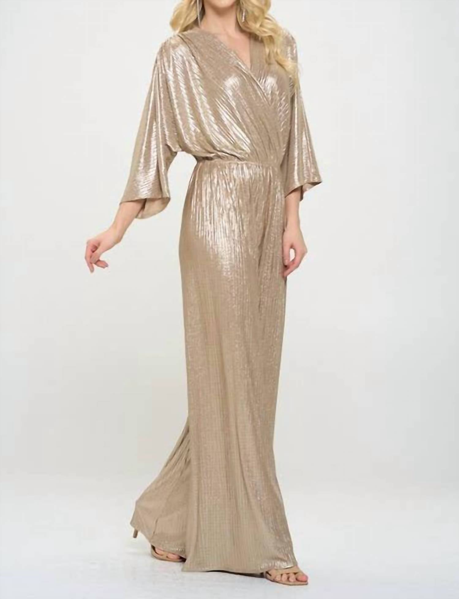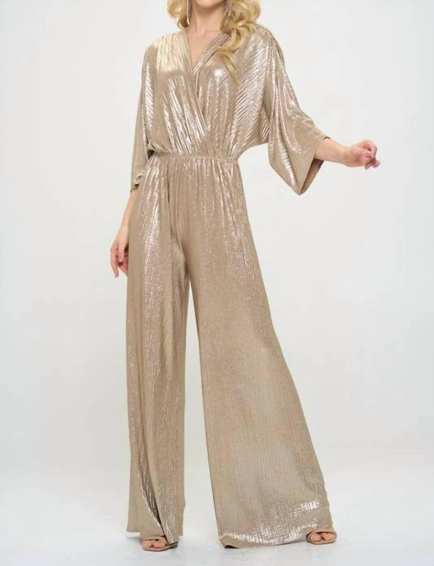 It doesn't take much for this one piece to look effortlessly cool. Add some statement jewelry to dress it up, or throw on some sneakers for a more casual vibe. Presenting the Gold Kimono Sleeve Wide Leg Jumpsuit by reneec., a blend of style and comfort made with 95% Polyester and 5% Spandex. This jumpsuit features flowing kimono sleeves and a chic wide leg design, perfect for adding elegance to your wardrobe. Proudly made in the USA, it easily pulls on for convenience. Available in sizes Small, Medium, and Large with a consistent length of 64 inches.