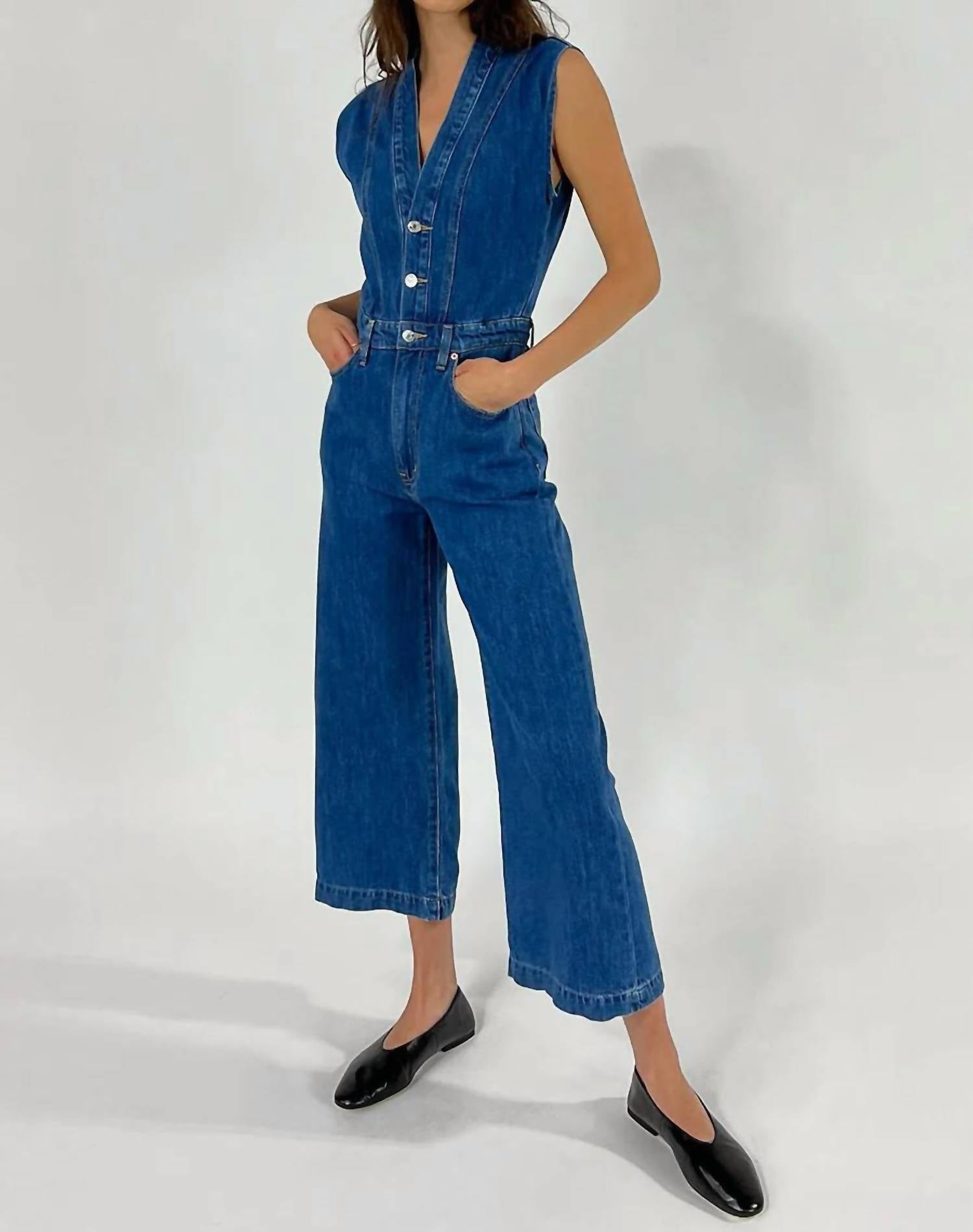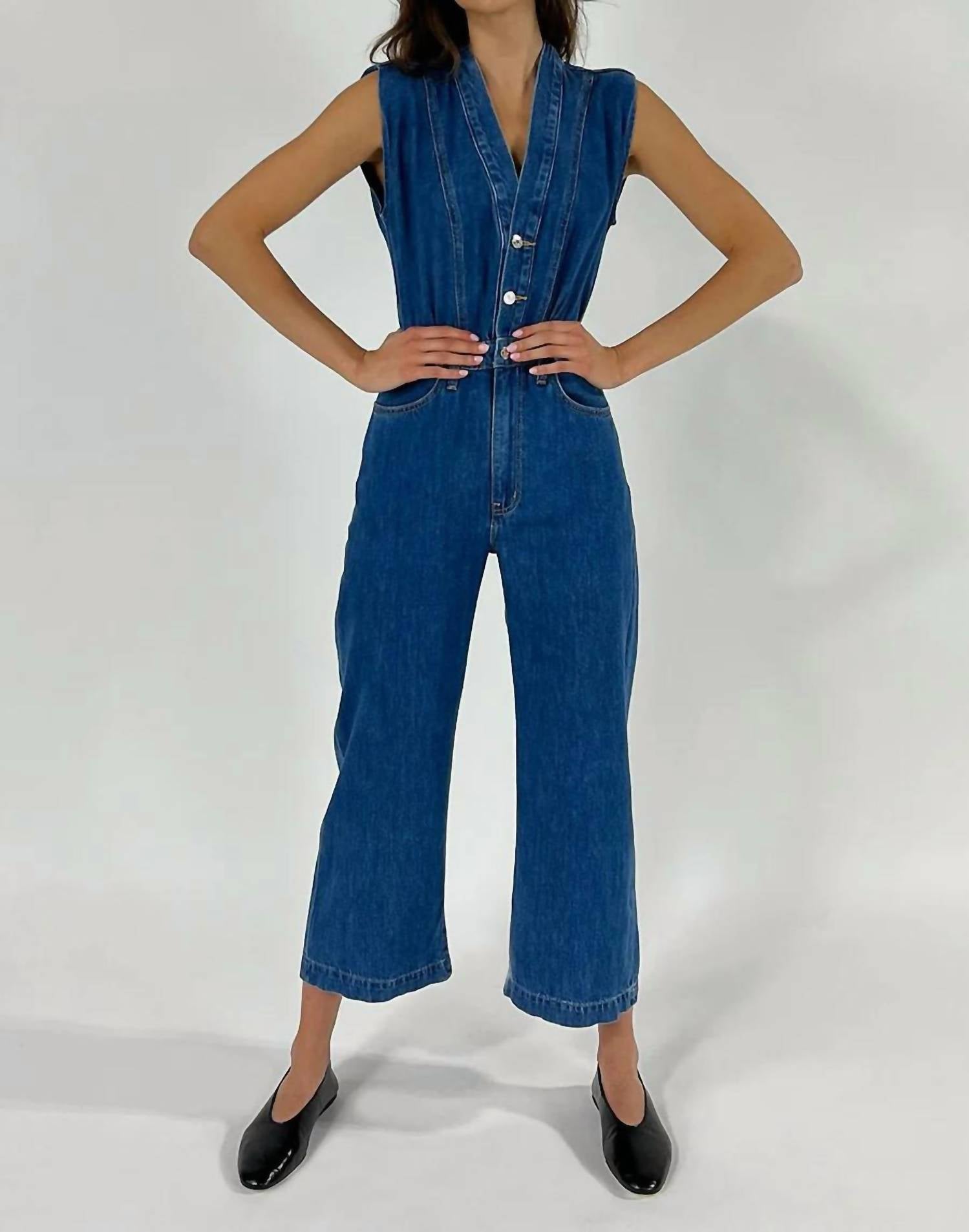 Throw it on and go! The Camden Denim Jumpsuit by ETICA in Lagoonbay is a chic addition to your wardrobe, perfect for spring vacations and streetwear trends. Featuring a relaxed fit, mid-rise waist, and straight leg, this jumpsuit is designed for comfort with its 27" inseam. Crafted from a cotton blend, it ensures a soft drape and vintage appeal, enhanced by signature front seaming. Closure: Button closure. Care: Machine wash.