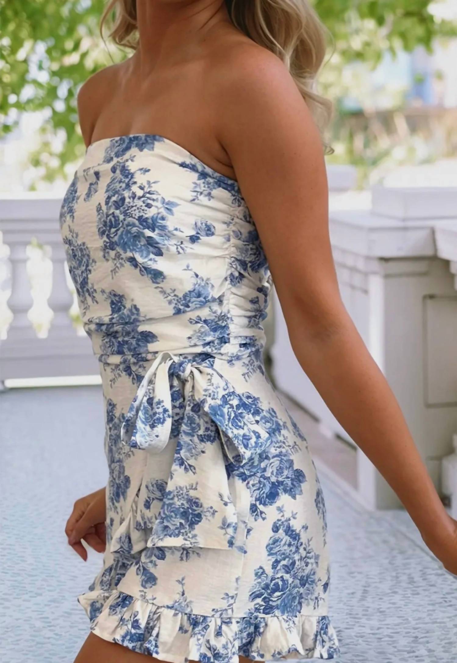 The perfect outfit choice when you you need something quick to throw on and still want to look efforlessly cool. Introducing The Finley Floral Romper by Little Daisy Closet, a quintessential summer piece for a boho chic look. This women's romper is strapless with a charming blue and white floral print and is crafted from 100% polyester for comfort and style. The fit and flare silhouette highlights your waist with a self-tie side bow, complemented by flirty ruffle trims, and ensures a perfect fit with a convenient zip closure. Care instructions recommend machine wash; model is 5'10" and wears a small.
