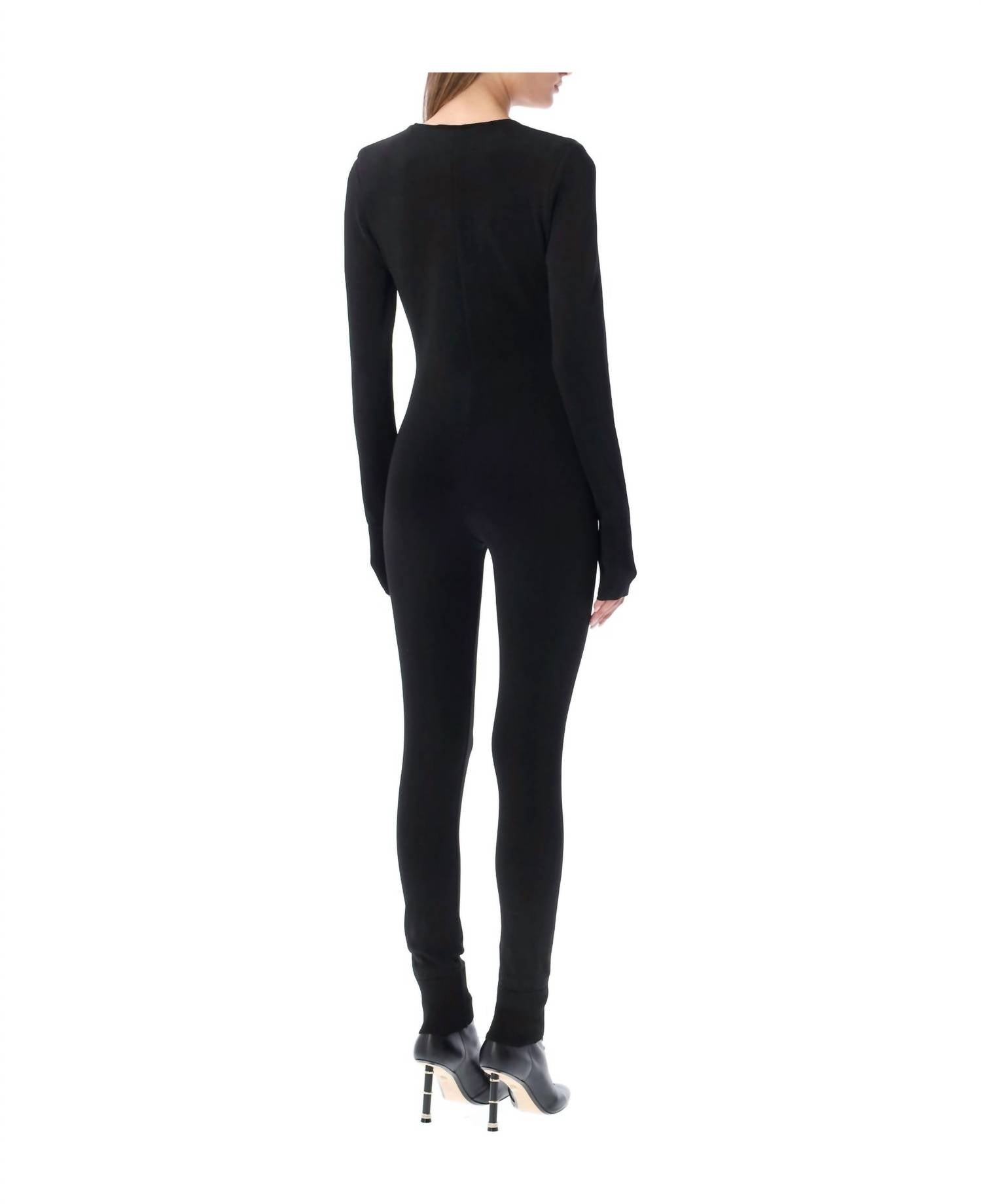 It doesn't take much for this one piece to look effortlessly cool. Add some statement jewelry to dress it up, or throw on some sneakers for a more casual vibe. Elevate your style with the V-neck String Jumpsuit by Philosophy di Lorenzo Serafini. This black jumpsuit features long sleeves and a slim fit silhouette, accentuated by a self-tie string closure at the front. It's crafted from 100% viscose, with ribbed cuffs and hem for added sophistication. Made in Italy, this jumpsuit embodies elegance and modernity. Model is 1.72m tall and wears size 40.