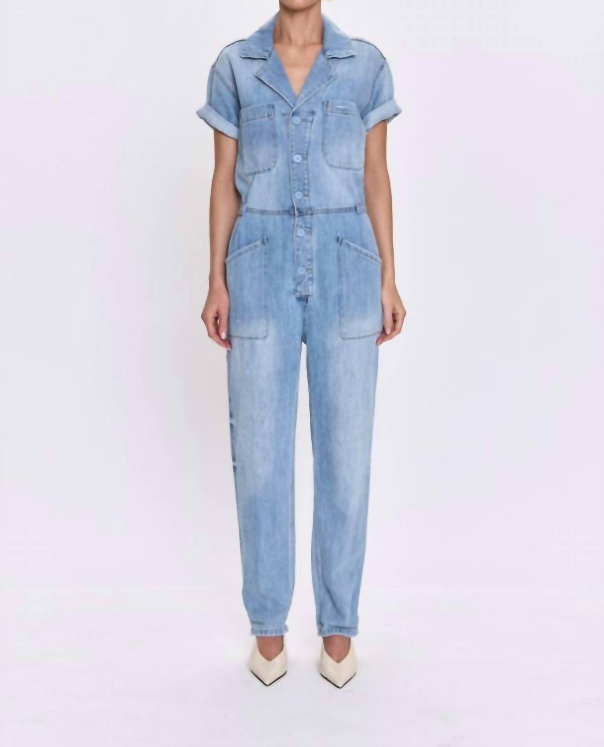 It doesn't take much for this one piece to look effortlessly cool. Add some statement jewelry to dress it up, or throw on some sneakers for a more casual vibe. Meet the Grover Button Front Jumpsuit by PISTOLA, a chic addition to your summer travels. Designed in durable 100% cotton, this solid, high-rise jumpsuit features a comfortable regular fit with straight legs and an inseam of 28 inches. A practical choice for the modern woman, it includes functional pockets and a stylish button closure. For care, simply machine wash and tumble dry.