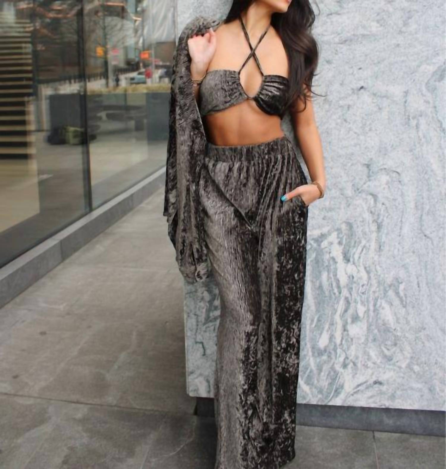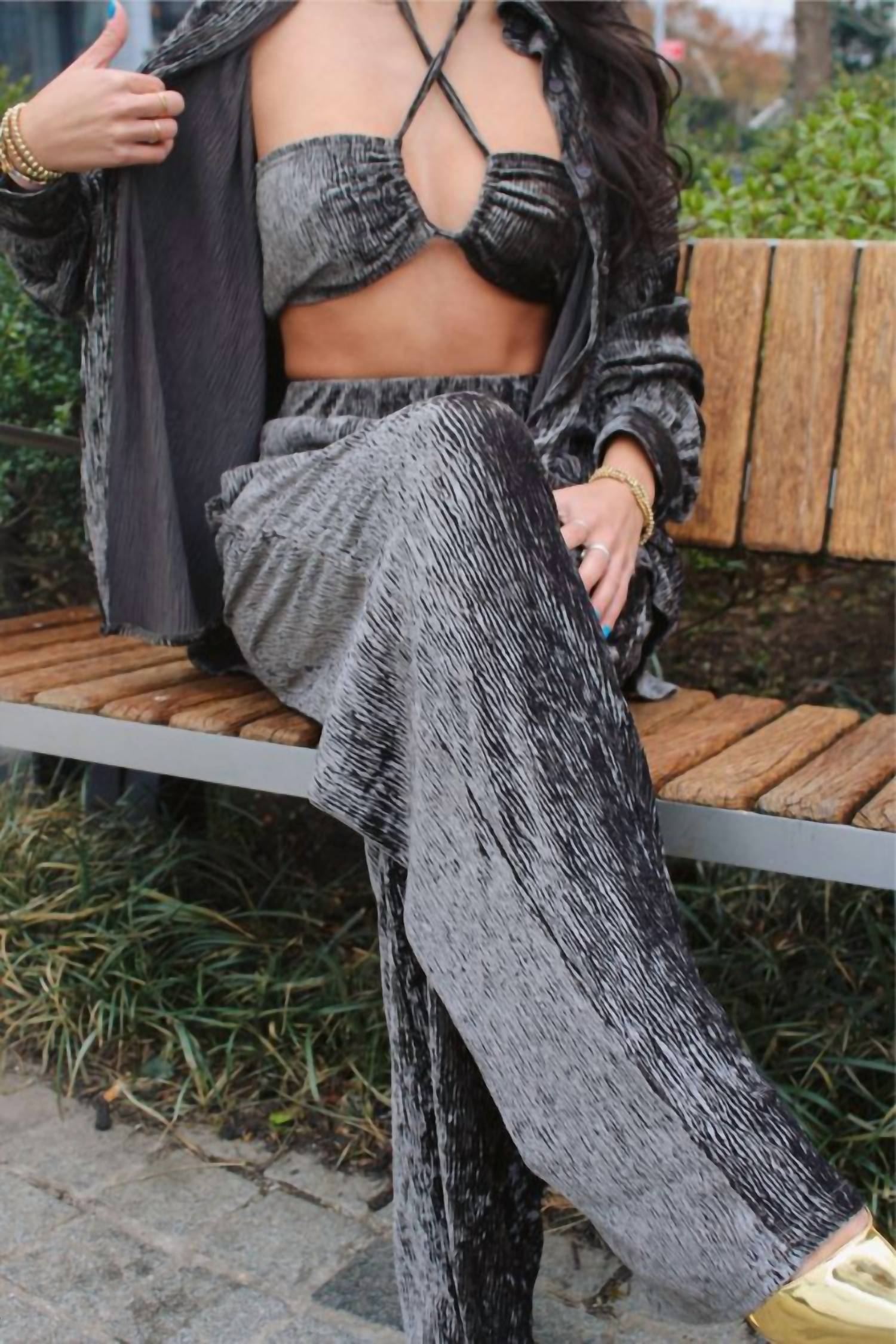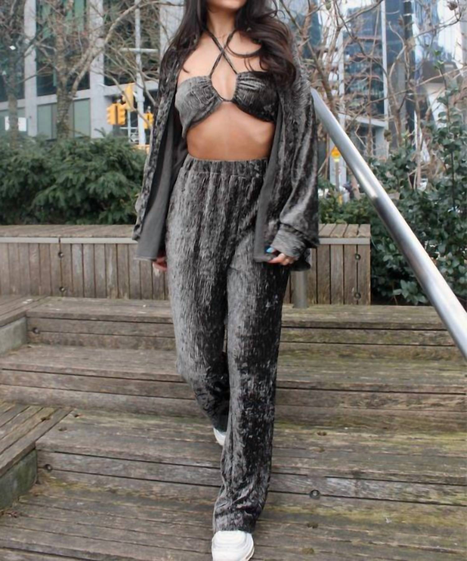 Introducing the Women's Made You Look 3 Piece Set by Pretty Garbage, a standout ensemble in elegant Charcoal Grey. Crafted from textured polyester, this set features a wide leg pant with a comfortable elastic waist and handy side seam pockets, complemented by an oversized button-up long sleeve top and a chic mini cross neck bandeau. Care instructions for this striking set include machine washing and laying flat to dry. Ideal for making a statement at any occasion, this set ensures both style and comfort.