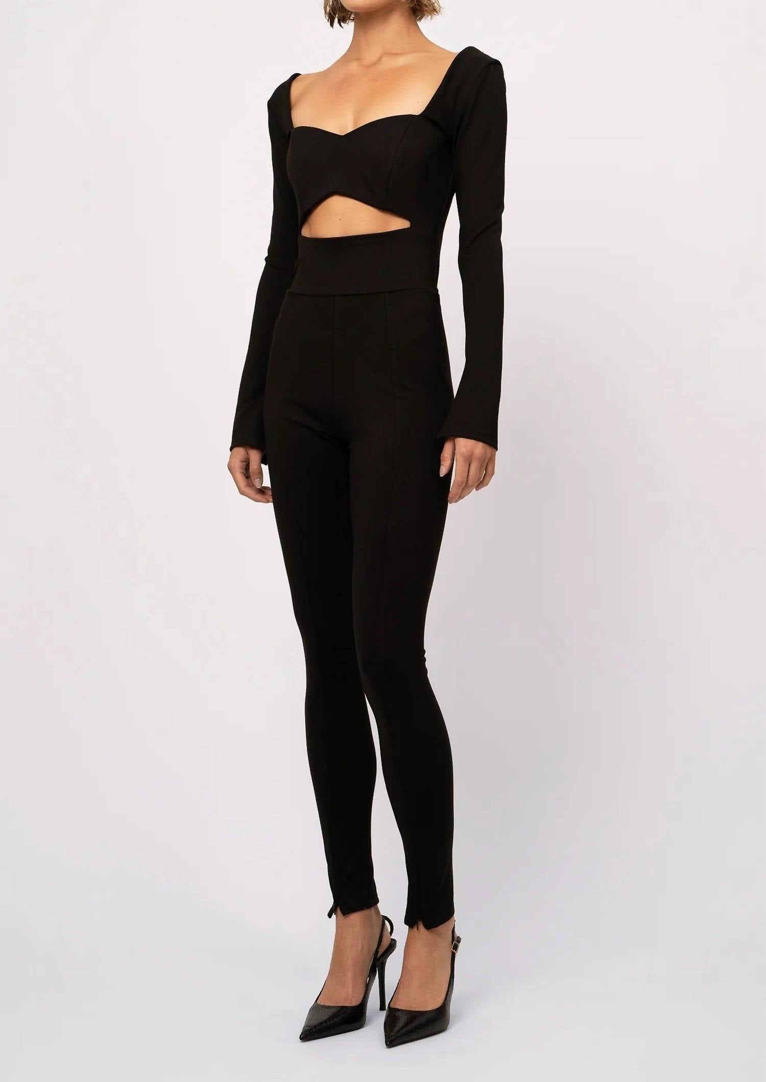 Throw it on and go! Meet the Joelle Catsuit by NONCHALANTLABEL, a sophisticated jumpsuit in timeless black designed to accentuate your silhouette. With its long sleeves and a tantalizing cutout, this piece effortlessly marries minimalism with allure. Crafted from soft, stretchy rayon, it features a skinny leg silhouette with a 30-inch inseam, complete with a 9-inch rise for perfect fit. Zip closure. Dry clean only. Country of Origin: Colombia.