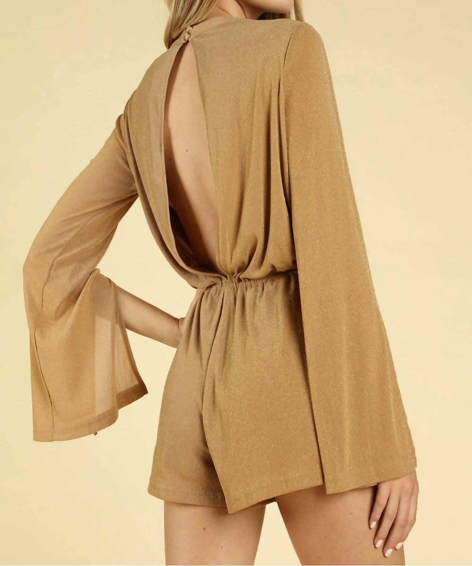 It doesn't take much for this one piece to look effortlessly cool. Add some statement jewelry to dress it up, or throw on some sneakers for a more casual vibe. Elevate your wardrobe with the Shimmering Long Sleeve Wrap Romper by Honey Punch in a captivating light brown hue. Designed with long sleeves featuring slits and a choker neckline, this romper showcases a plunging surplice bodice and an elegant keyhole back. Crafted from an 85% nylon and 15% spandex blend with a 100% polyester lining, it boasts a comfortable and flattering fit. Closure type: Button closure. Care instructions: Machine wash and lay flat to dry. Available in sizes with a bust range from 34" to 38" and a consistent length of 29" from shoulder to hem.
