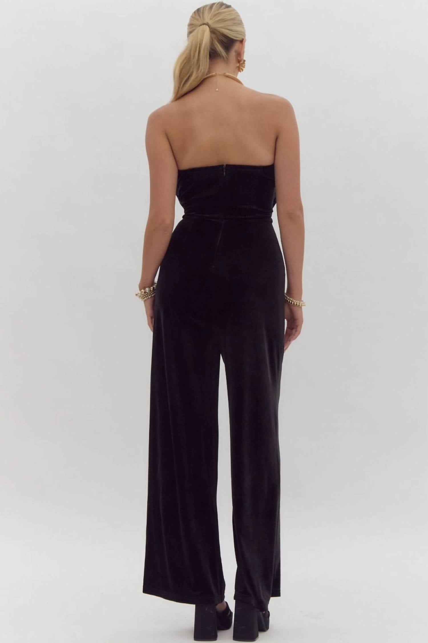 Throw it on and go! Get ready to shine with the Strapless Glittery Velvet Romper by Entro, a perfect blend of style and elegance in classic black. Adorned with sequin embellishments and a pleated top, this velvet romper is designed to turn heads. Crafted from a blend of 95% Polyester and 5% Spandex, it features a hidden zipper closure and practical side pockets. Ideal for evening events, especially New Year's Eve, this wide-leg, high-rise piece offers a relaxed fit for comfortable wear.