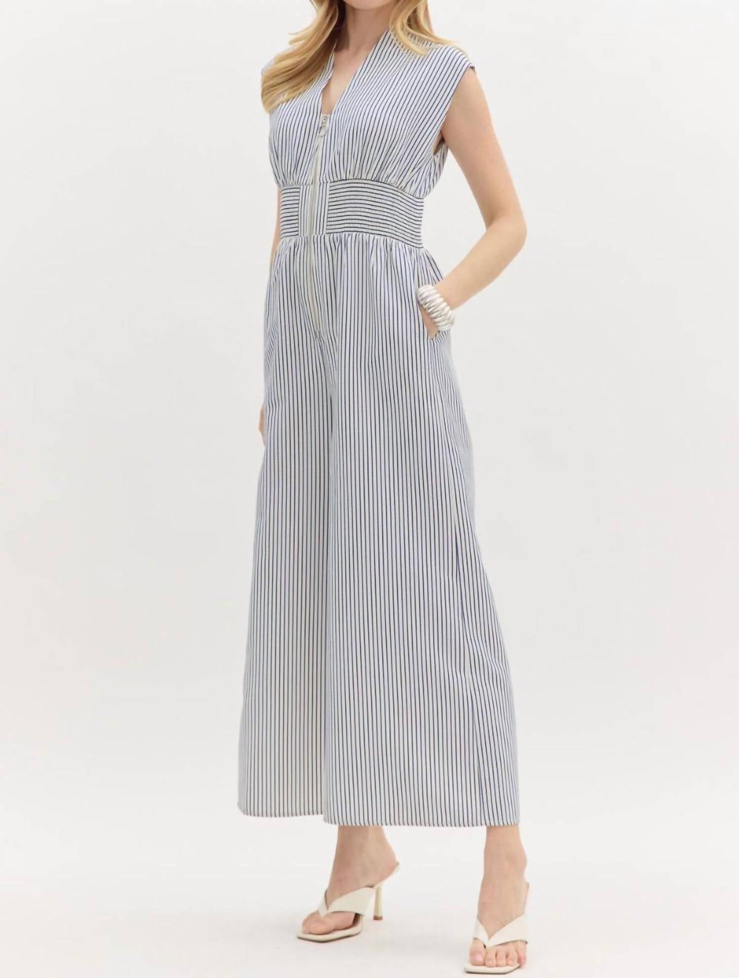 Throw it on and go! This ankle-length jumpsuit is made from 100% polyester and features a bold stripe pattern, structured sleeveless shoulders, and a front zipper closure. It has a smocked waist for comfort, side pockets, and a fully lined, lightweight woven fabric.