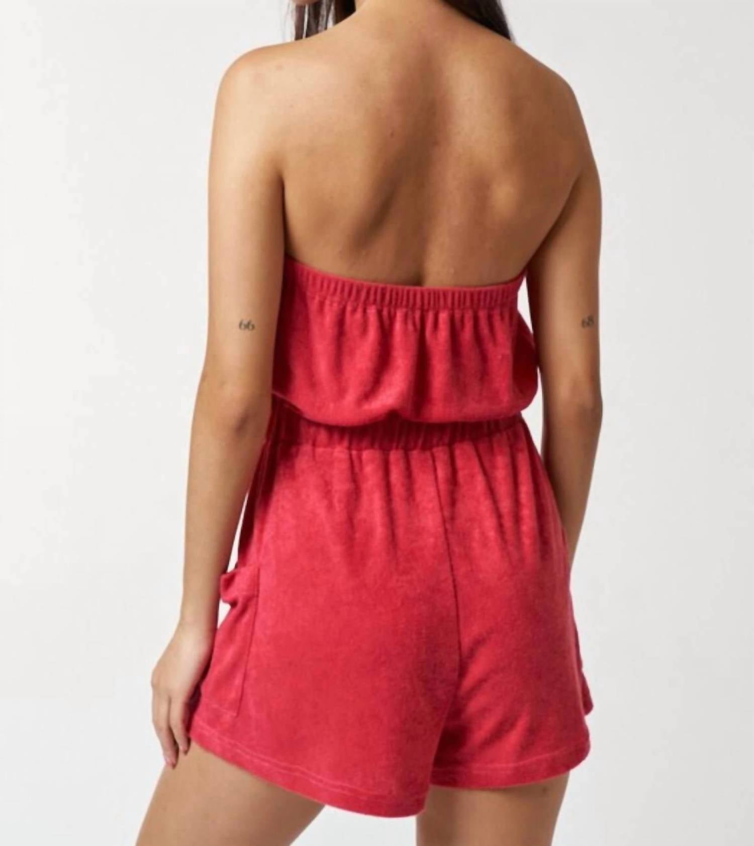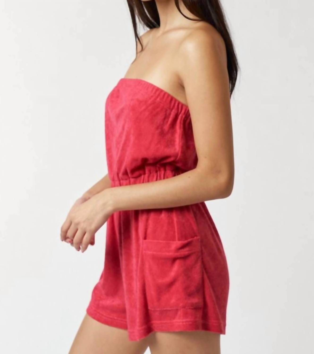 Throw it on and go! Introducing the Strapless Terry Romper by Blue Blush, a must-have for summer days in a vibrant red hue. This romper features a flexible elastic waistband and is crafted from 100% polyester terry fabric for ultimate comfort. Originating from CN, it offers a pull-on closure for hassle-free style, complete with functional side pockets for convenience. Care: Hand wash for best results and keep it looking fresh for beach days or laid-back outings.