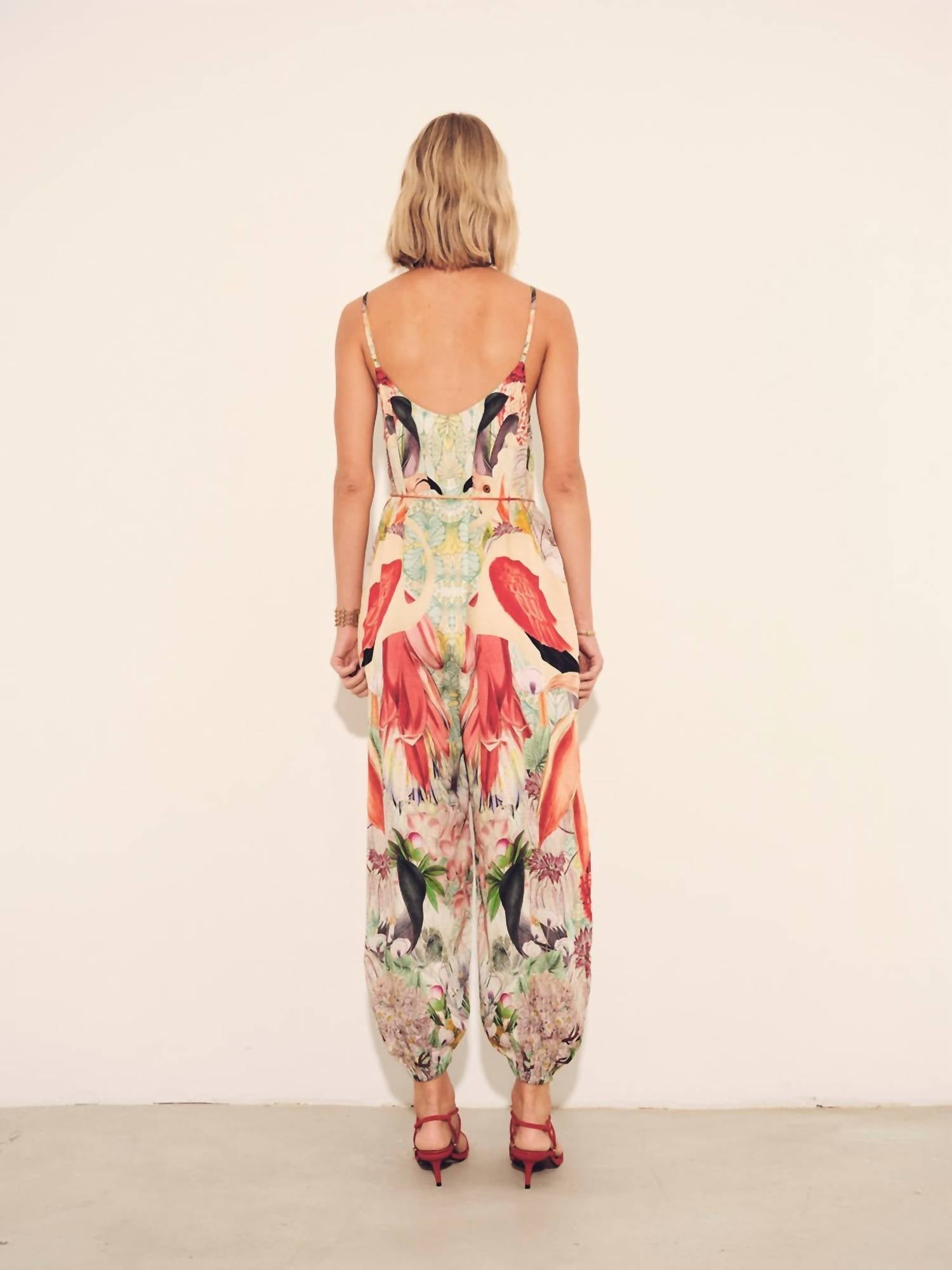 Throw it on and go! Introducing the Flamingos Balloon Jumpsuit by CAROLINA K, an artfully inspired piece created in collaboration with French artist Henriette Arcelin. This women's jumpsuit is crafted from 100% sustainable Viscose Ecovero Satin and features a relaxed silhouette with a flattering V-neckline and adjustable back straps. Made in India with a stylish patterned design, it includes a practical tie closure and pockets for added convenience. Care: Dry clean or machine wash gentle cold, hang to dry. Model wears size small.