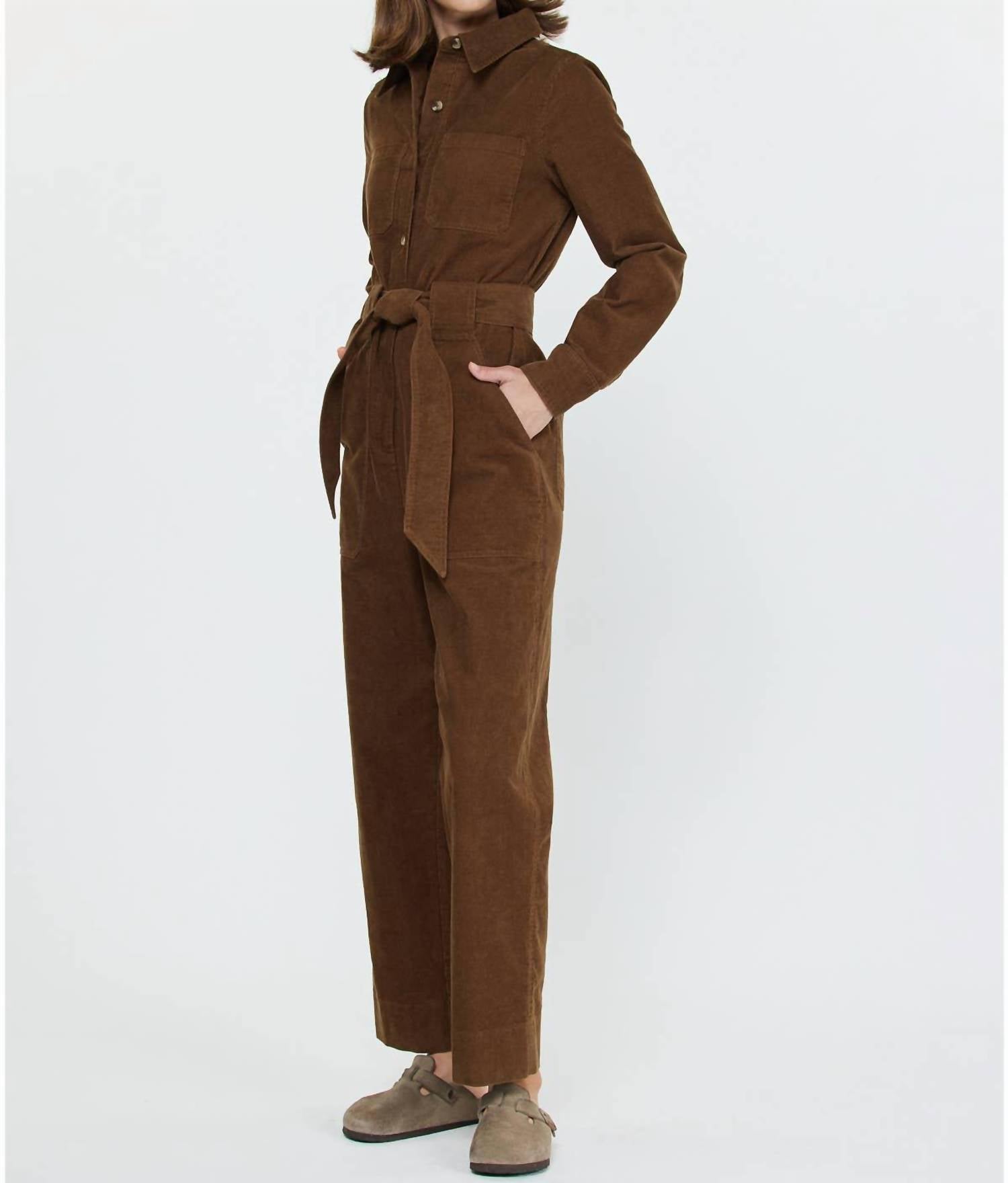 It doesn't take much for this one piece to look effortlessly cool. Add some statement jewelry to dress it up, or throw on some sneakers for a more casual vibe. Embrace the elegance of fall with the Corduroy Long Sleeve Jumpsuit by Current Air, perfect for sophisticated streetwear. This women’s jumpsuit features long sleeves with buttoned cuffs and a button-front closure, enhanced by a self-tie waist belt for a relaxed fit. Crafted from soft, textured 100% corduroy, this piece features chest and back patch pockets for added practicality. Care instructions: Machine wash on a gentle cycle in cold water. The straight leg design in a rich brown hue makes it ideal for engagement occasions and Thanksgiving gatherings.