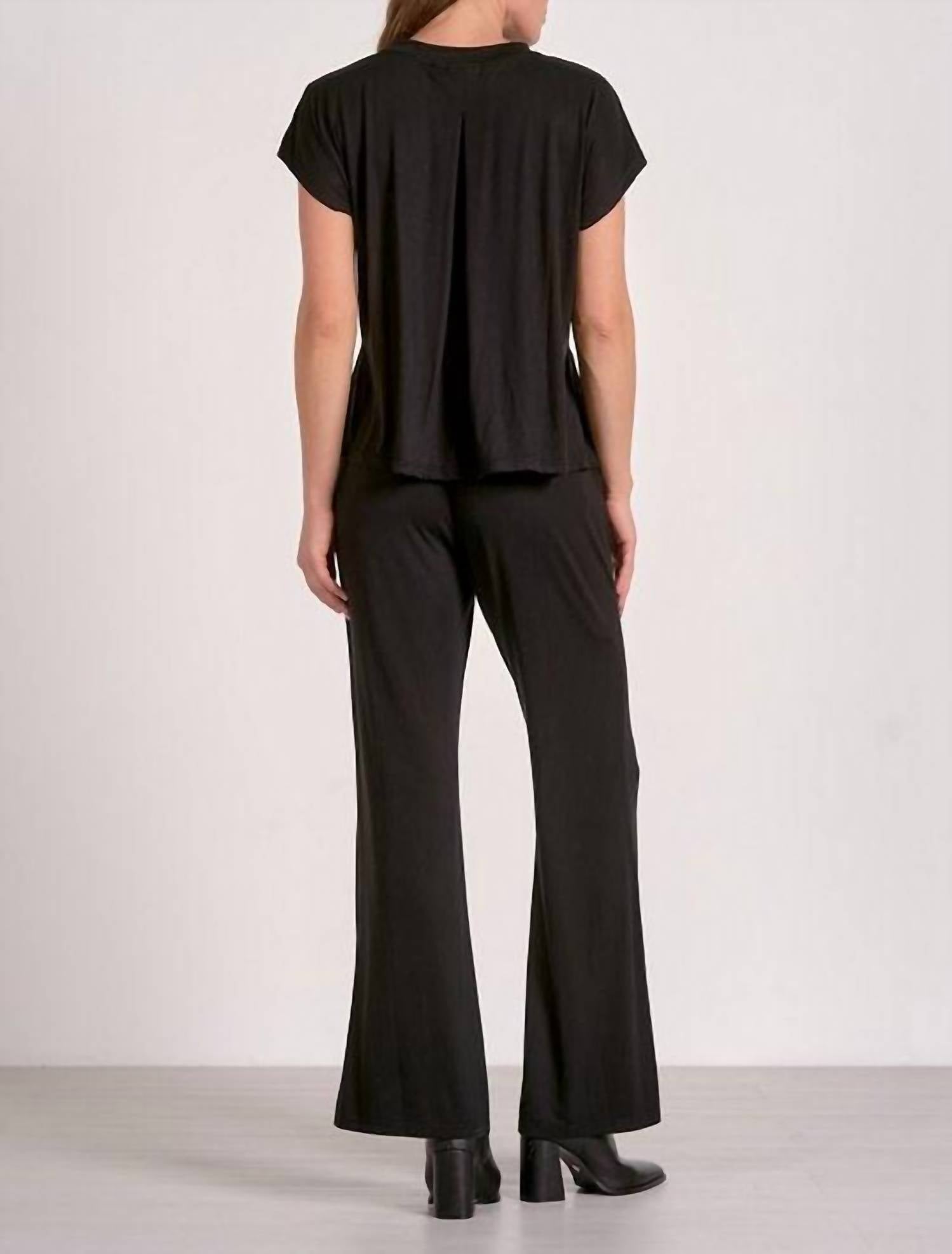 Throw it on and go! Step into elegance with the Malia Jumpsuit by ELAN, a stylish staple for any holiday party. Crafted from luxurious modal, this jumpsuit showcases a solid black color with a relaxed fit and flared leg, perfect for a chic monochrome look. Adorned with practical pockets and designed with a convenient pull-on closure, it effortlessly combines comfort with sophistication. Embrace the spirit of spring in this timeless piece that will seamlessly take you from day to night. 72% Modal 24% Polyester 4% Spandex.