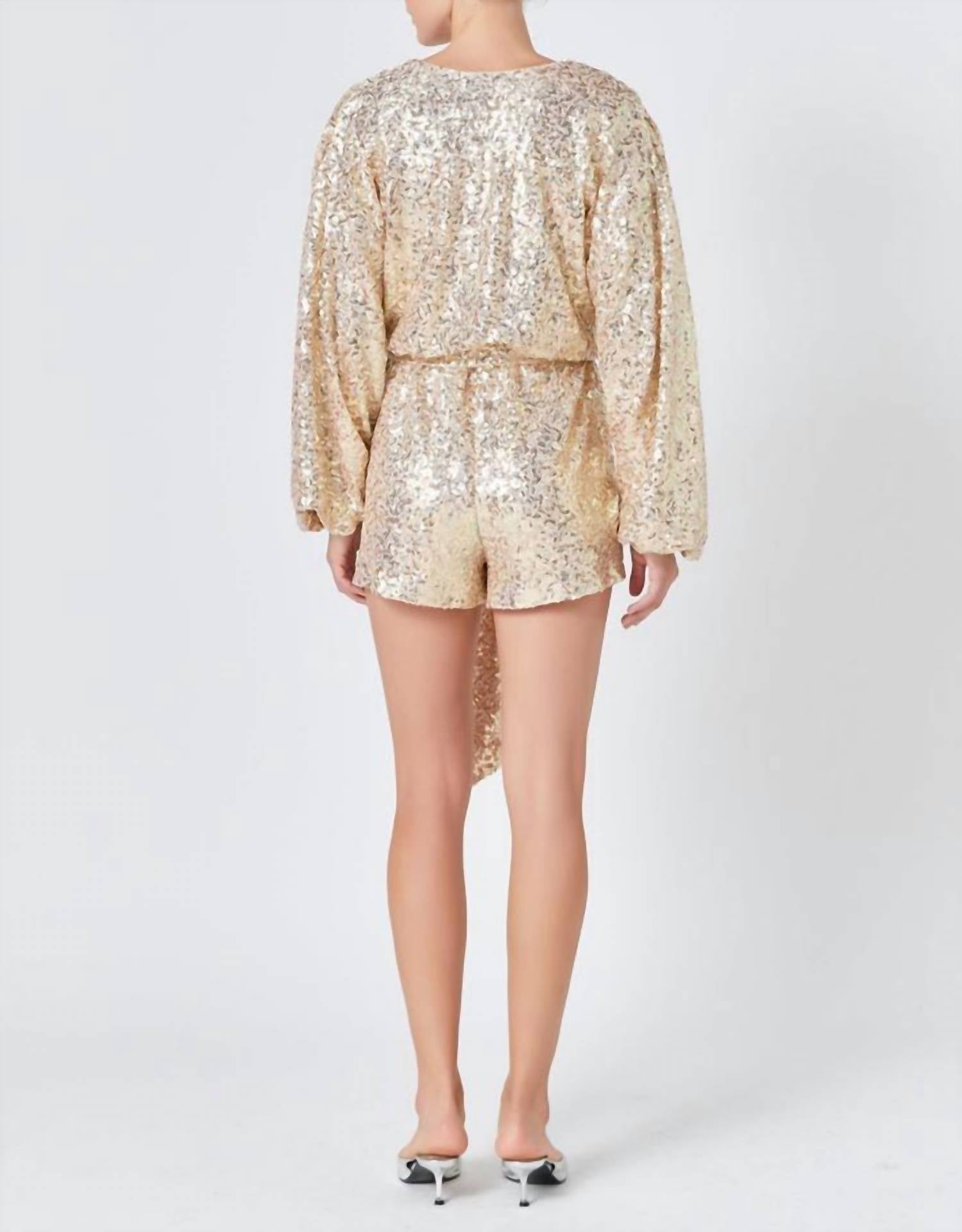 It doesn't take much for this one piece to look effortlessly cool. Add some statement jewelry to dress it up, or throw on some sneakers for a more casual vibe. Dazzle in the Sequins Romper by English Factory, a stunning choice for any occasion with its textured gold design. This loose-fitting piece features long balloon sleeves with elastic at the wrists, a surplice neckline, and a snap button closure to keep the front secure. Crafted from 100% polyester, the romper also includes a removable sequin belt and an elastic cinched waistband for a flattering fit. For care, hand wash cold, do not bleach, or tumble dry, and iron on low if needed.
