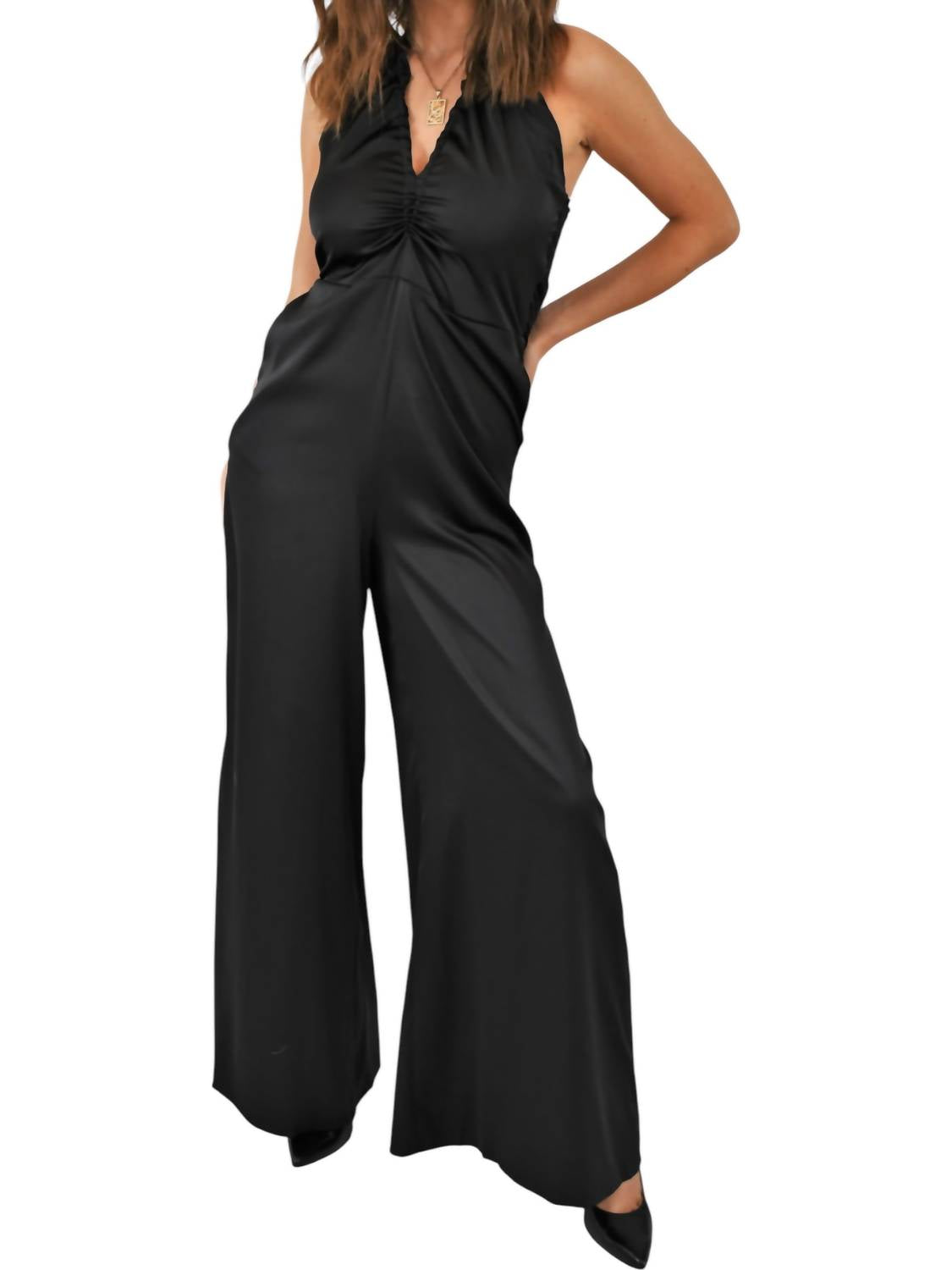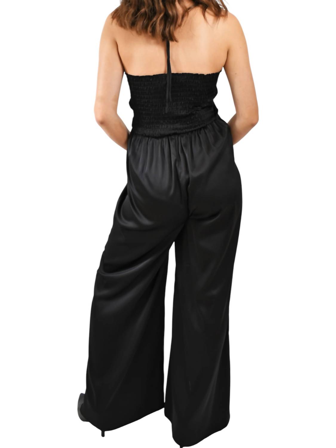 The perfect outfit choice when you you need something quick to throw on and still want to look efforlessly cool. Introducing the Blazing Hot Jumpsuit by GRADE & GATHER, a stylish choice in classic black for your holiday party. This stunning jumpsuit features a halter tie closure with a V-neck and a smocked back for a perfect fit. Crafted from 95% polyester and 5% spandex, it offers a silky flow with convenient pockets and a wide leg style. Trendy and versatile, it's designed for a high-rise fit and aligned with the Y2K spring trend.