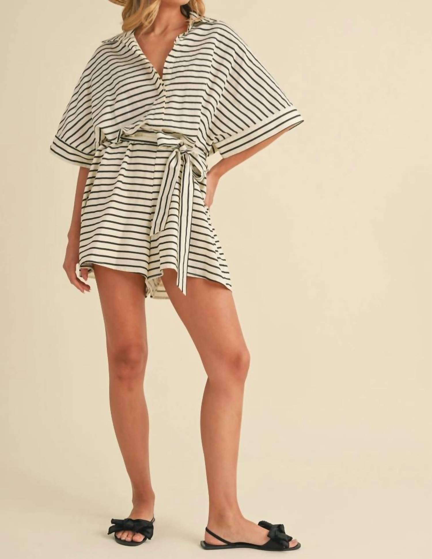 It doesn't take much for this one piece to look effortlessly cool. Add some statement jewelry to dress it up, or throw on some sneakers for a more casual vibe. Meet the Sunkissed Short Sleeve Romper by Klesis, a chic addition to your monochrome collection with its elegant black and ivory stripes. This relaxed fit romper is crafted from a comfortable cotton blend and features a hidden button detail and a stylish belt for a flattering fit. It is finished with a convenient tie closure, making it perfect for a vacation ensemble or a New Year's Eve outfit. Care instructions: Hand wash and line dry to maintain its pristine appearance.