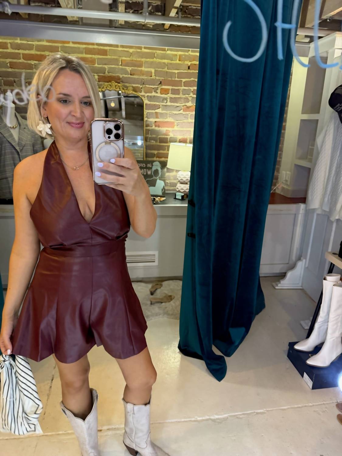 The perfect outfit choice when you you need something quick to throw on and still want to look efforlessly cool. Introducing the Ella V-neck Romper by Mustard Seed, a head-turning piece designed for bold fashion statements. This romper features a playful halter top and a daring deep V-neck, crafted from smooth, cruelty-free vegan leather in a striking Red Wine hue. It's the perfect choice for fun nights out or making a statement at any event, and fits seamlessly into a monochrome trend for the spring season.