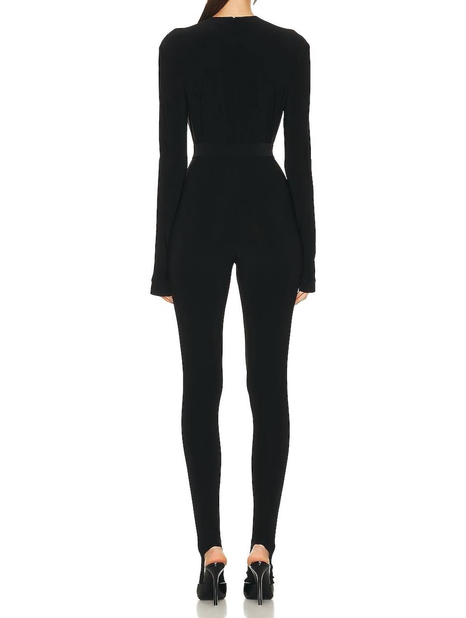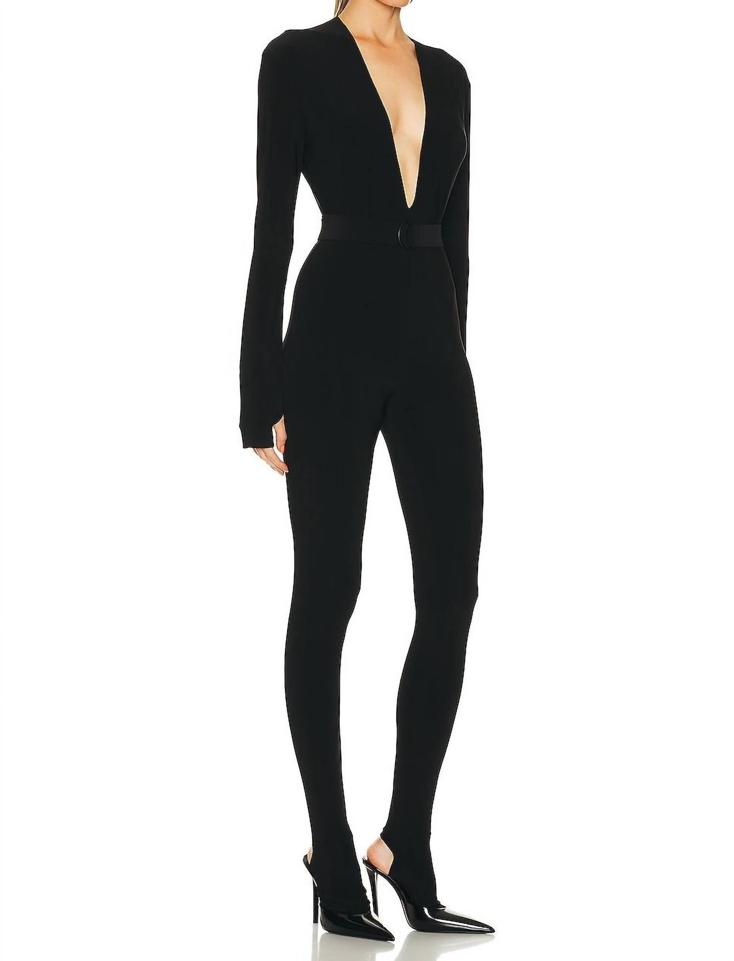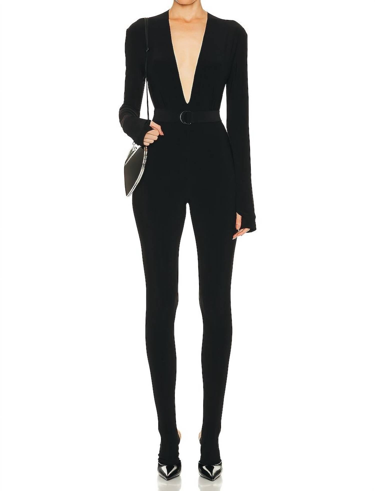 Throw it on and go! Introducing the V-neck With Footie Catsuit by NORMA KAMALI, a stylish addition to your wardrobe. Crafted from high-quality 4-way stretch poly lycra, this catsuit is made with 95% polyester and 5% spandex for durability through multiple washes. Designed in solid black, it features long sleeves, thumbholes, stirrup foot, and a D-ring belt, emphasizing both comfort and style. The slim fit and pull-on closure offer a sleek silhouette, making it perfect for any engagement occasion. Care: Machine wash.