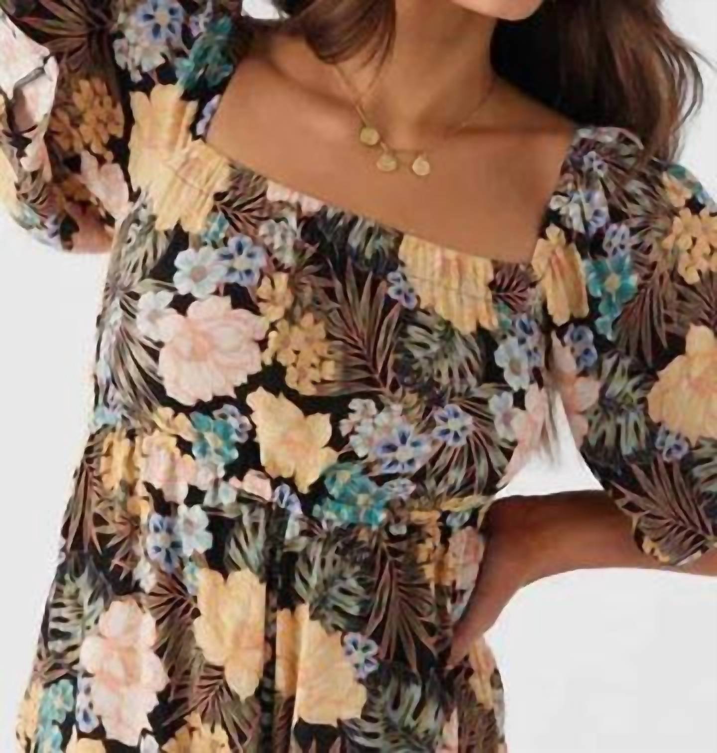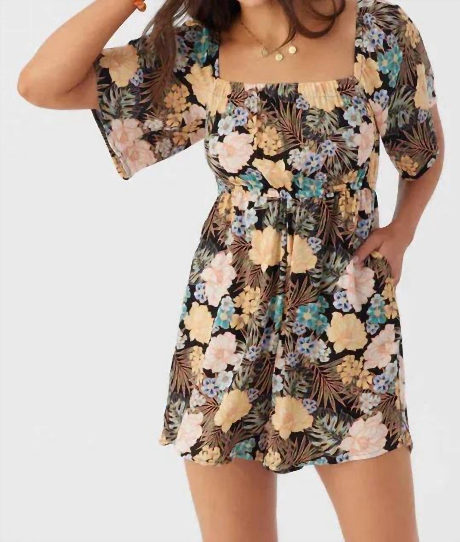 It doesn't take much for this one piece to look effortlessly cool. Add some statement jewelry to dress it up, or throw on some sneakers for a more casual vibe. Embrace effortless style with the Women's Jaslynn Tropical Romper by O'Neill, perfect for your next vacation. This black romper, crafted from 100% viscose, features flutter sleeves and an allover geometric print that embodies a maximalist trend. Designed with an elastic neck and waist for comfort, it includes side seam pockets and a pull-on closure. With a 16.5'' inseam length, this romper offers a lightweight feel ideal for spring getaways.