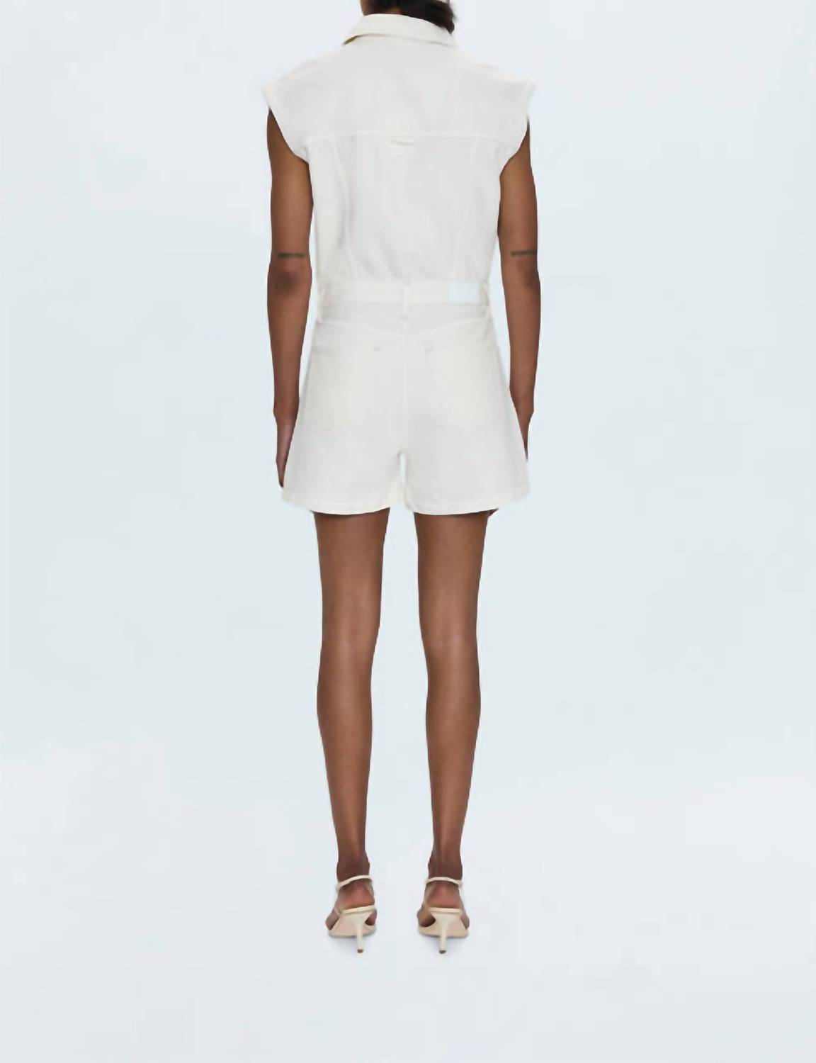 The perfect outfit choice when you you need something quick to throw on and still want to look efforlessly cool. Meet the Lennox Sleeveless Utility Romper by PISTOLA, an ecru essential crafted from a comfortable cotton blend. Perfect for summer occasions or Thanksgiving vacations, it embraces a chic 90s fashion vibe with its solid pattern and practical pockets. Featuring a 12.25" rise, this romper offers a contemporary silhouette with a fashionable utility aspect. Closure: Snap closure. Care: Machine wash, tumble dry.