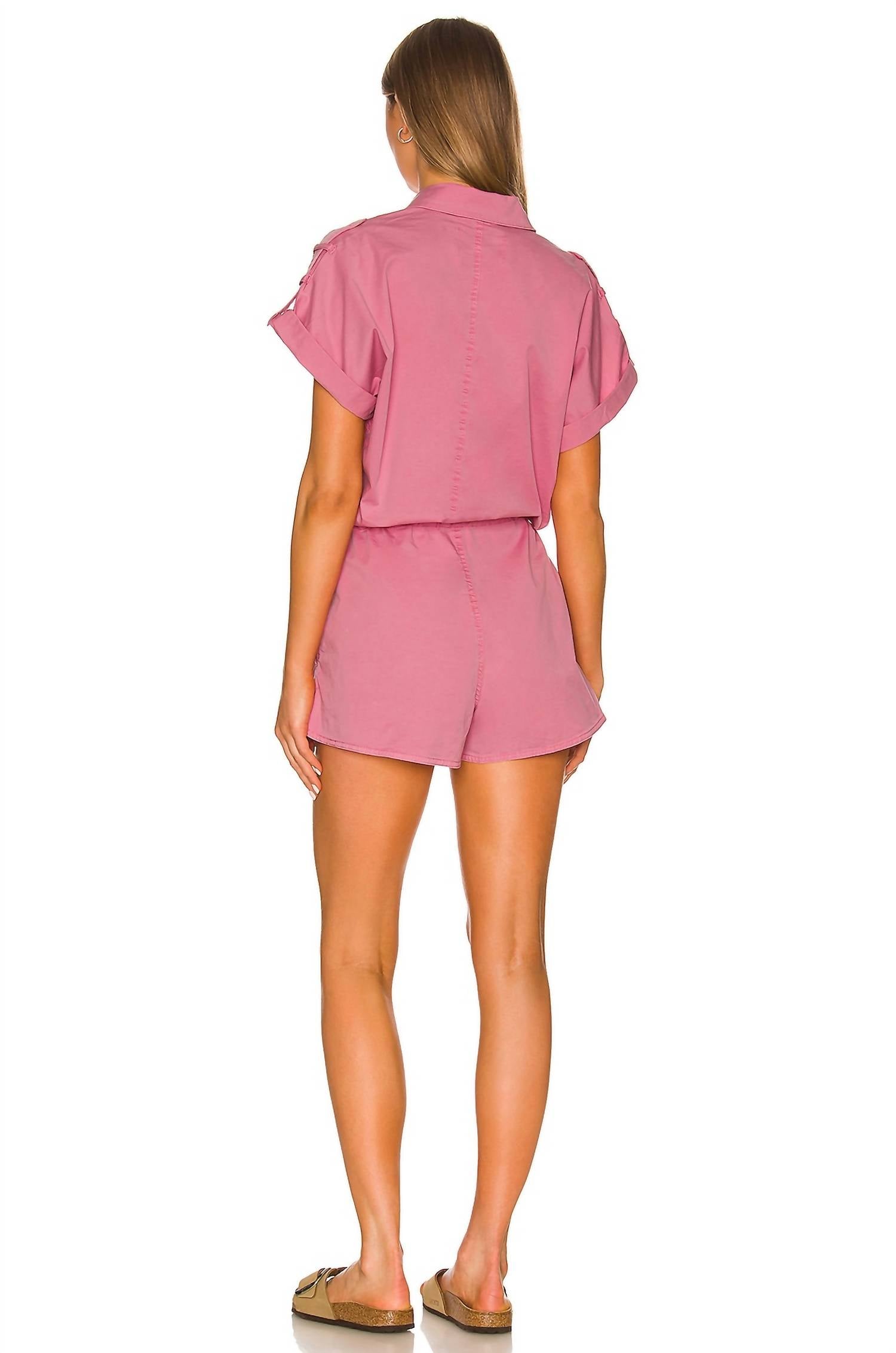 Throw it on and go! Elevate your summer wardrobe with the Meg Romper by PISTOLA in an eye-catching Flamingo hue. Featuring short sleeves with cuffed snap buttoned shoulder tabs and a zippered front closure, this romper exudes a relaxed yet chic vibe. Crafted from a breathable cotton blend of 98% cotton and 2% spandex, it is made in China and designed with an adjustable drawstring at the high-rise waist for a customizable fit. Functional side seam pockets add practicality, and the romper is easy to maintain with simple machine wash care.