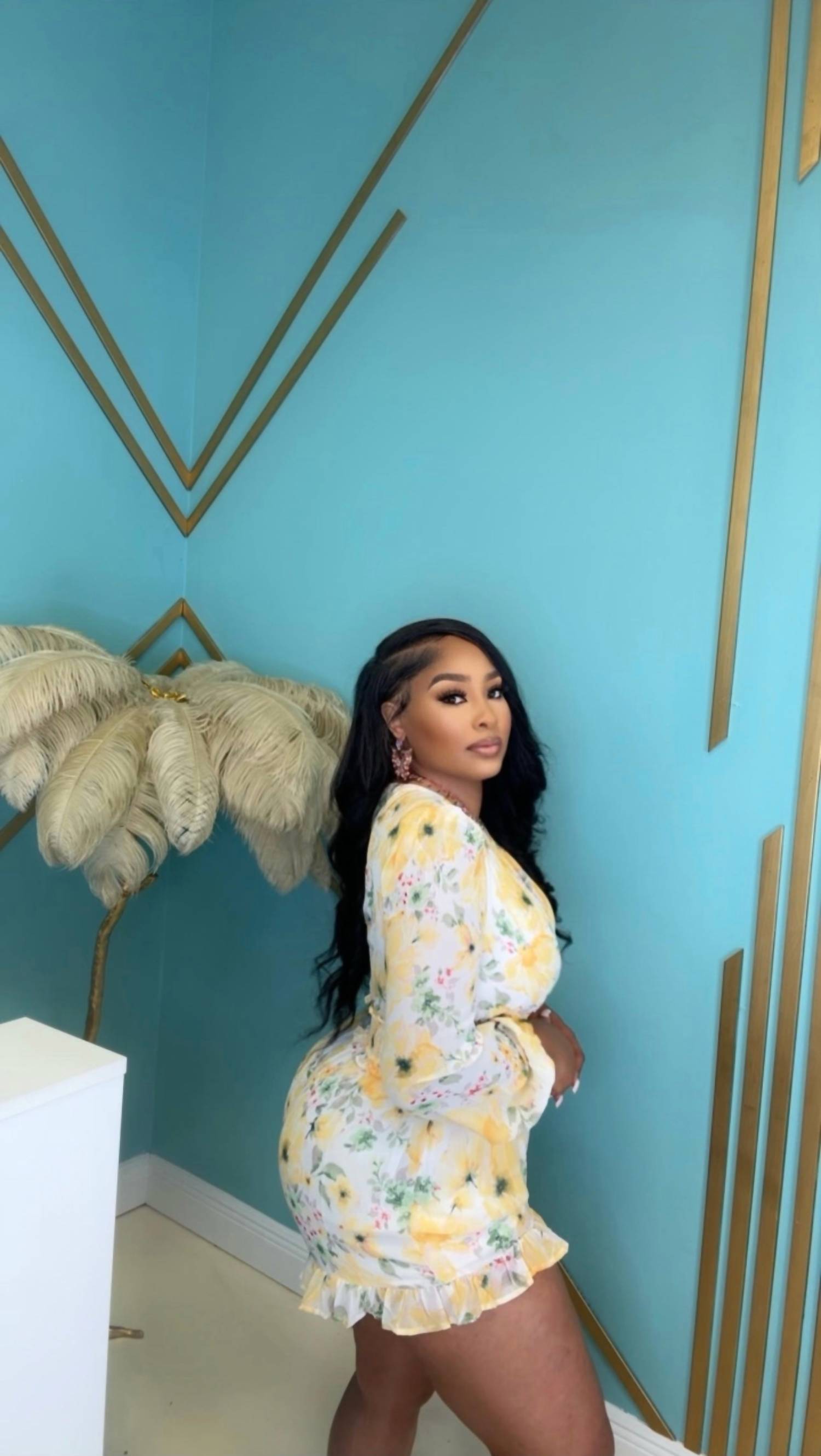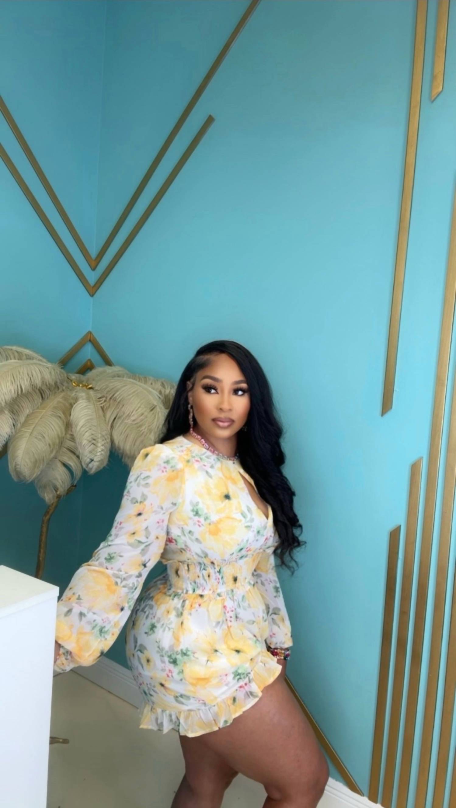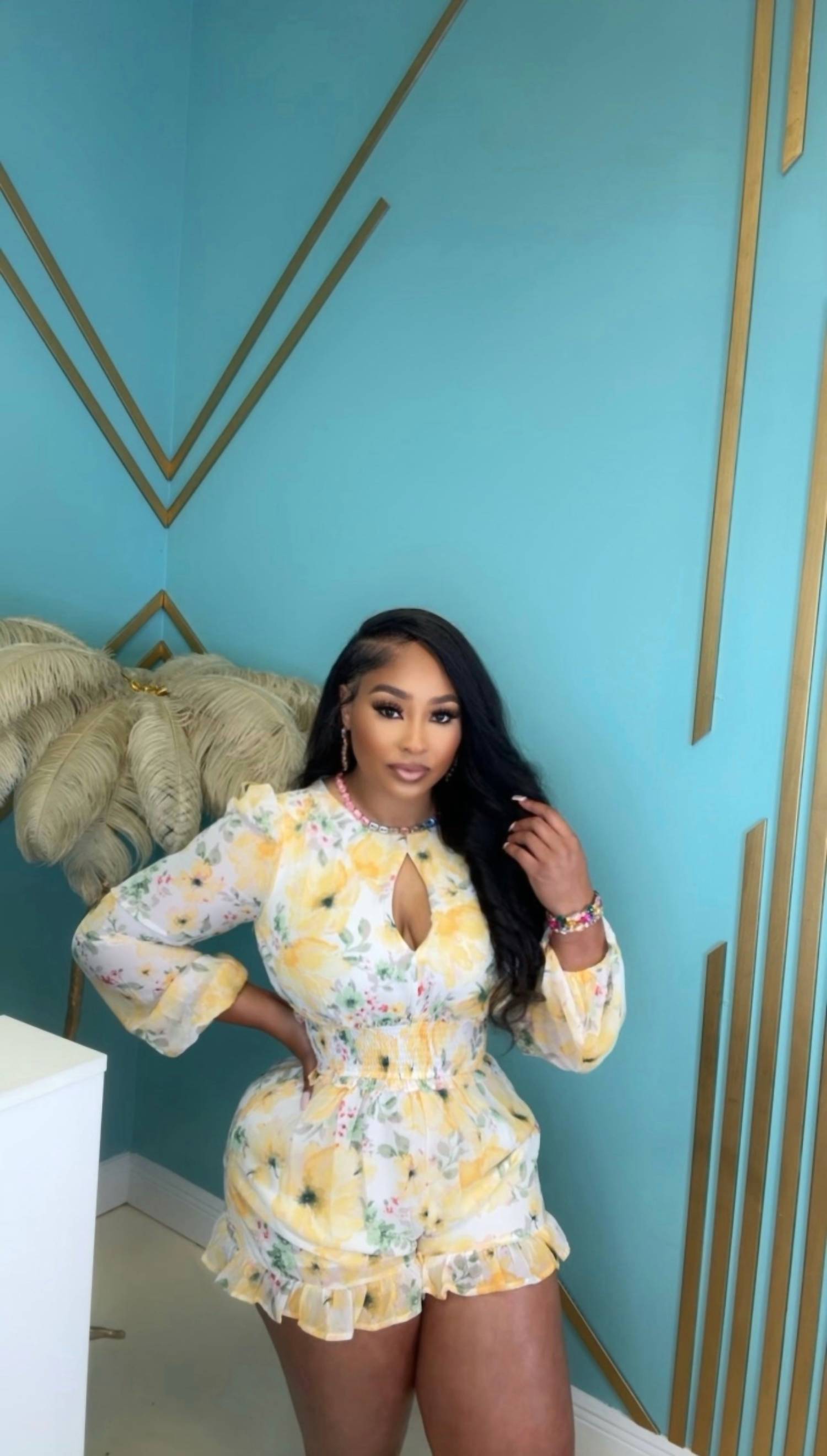 Throw it on and go! Elevate your summer wardrobe with the PRIVY Floral Chiffon Ruffled Romper in a vibrant Yellow Multi color, perfect for a Boho Chic ensemble. This long sleeve romper features a V-neckline and a smocked waist, adding a flattering touch to its bodycon silhouette. Made from 100% polyester, this imported piece showcases a romantic floral pattern. Model is 5'8" and is wearing a size small.