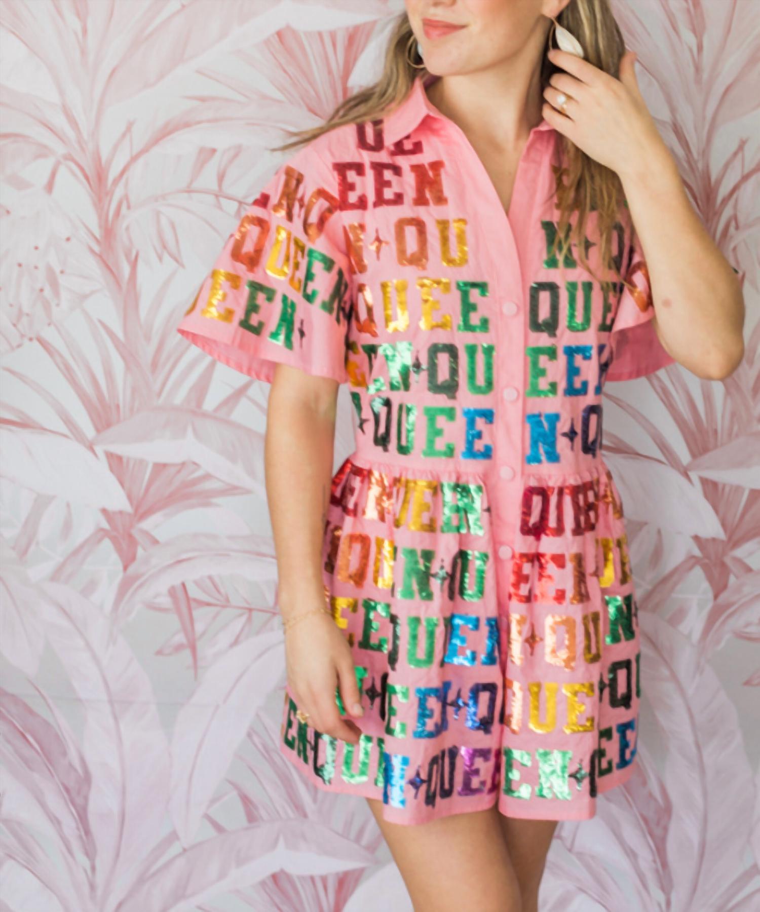 Throw it on and go! Introducing the Rainbow Queen Romper by QUEEN OF SPARKLES, a must-have piece that adds a touch of glam to any occasion. This eye-catching pink romper sparkles with its graphic design, promising to turn heads. Perfectly suited for those who love to make a statement.