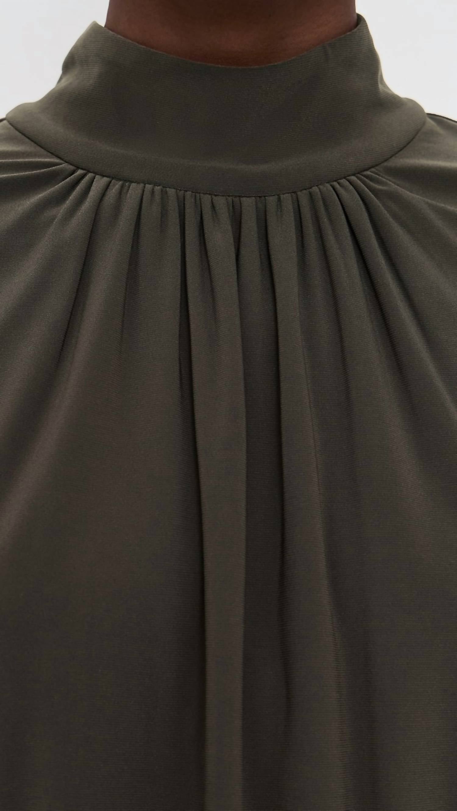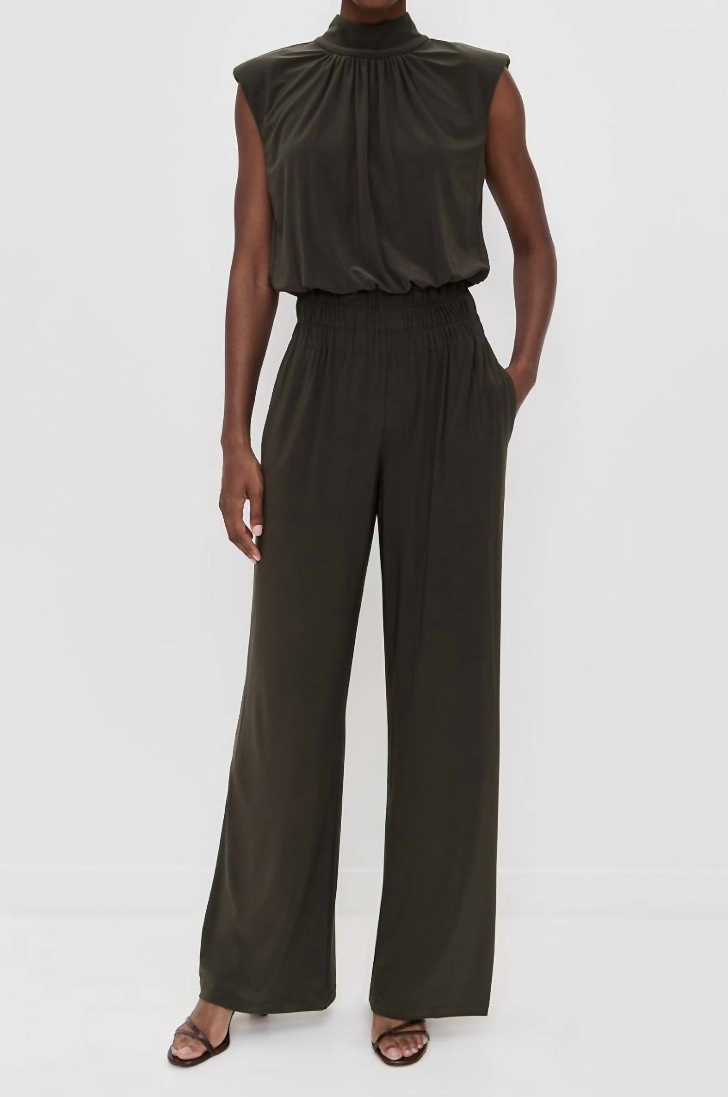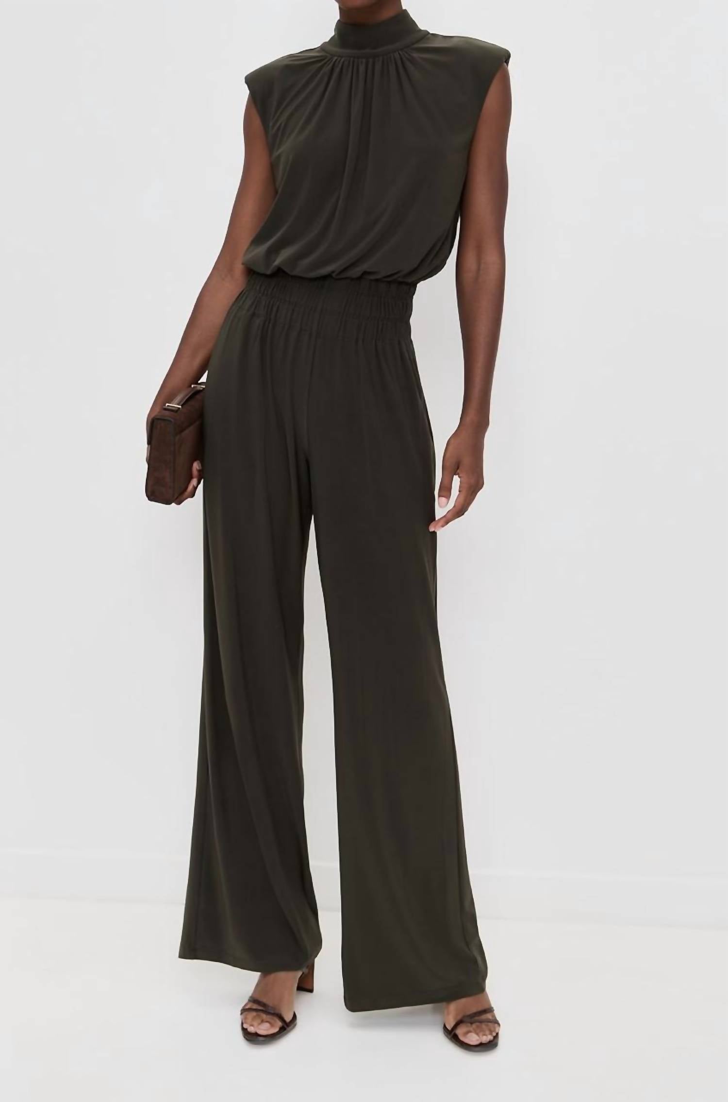 It doesn't take much for this one piece to look effortlessly cool. Add some statement jewelry to dress it up, or throw on some sneakers for a more casual vibe. Elevate your wardrobe with the Ramy Brook Dani Sleeveless Jumpsuit in Deep Olive, a perfect blend of style and comfort. This high-neck, sleeveless jumpsuit is crafted from a mid-weight, super-stretch slinky jersey composed of 96% polyester and 4% spandex. Originating from China, it features a relaxed wide-leg fit and an elastic waistband, complemented by a button keyhole closure at the back. Care for this chic piece with dry cleaning to maintain its quiet luxury appeal.