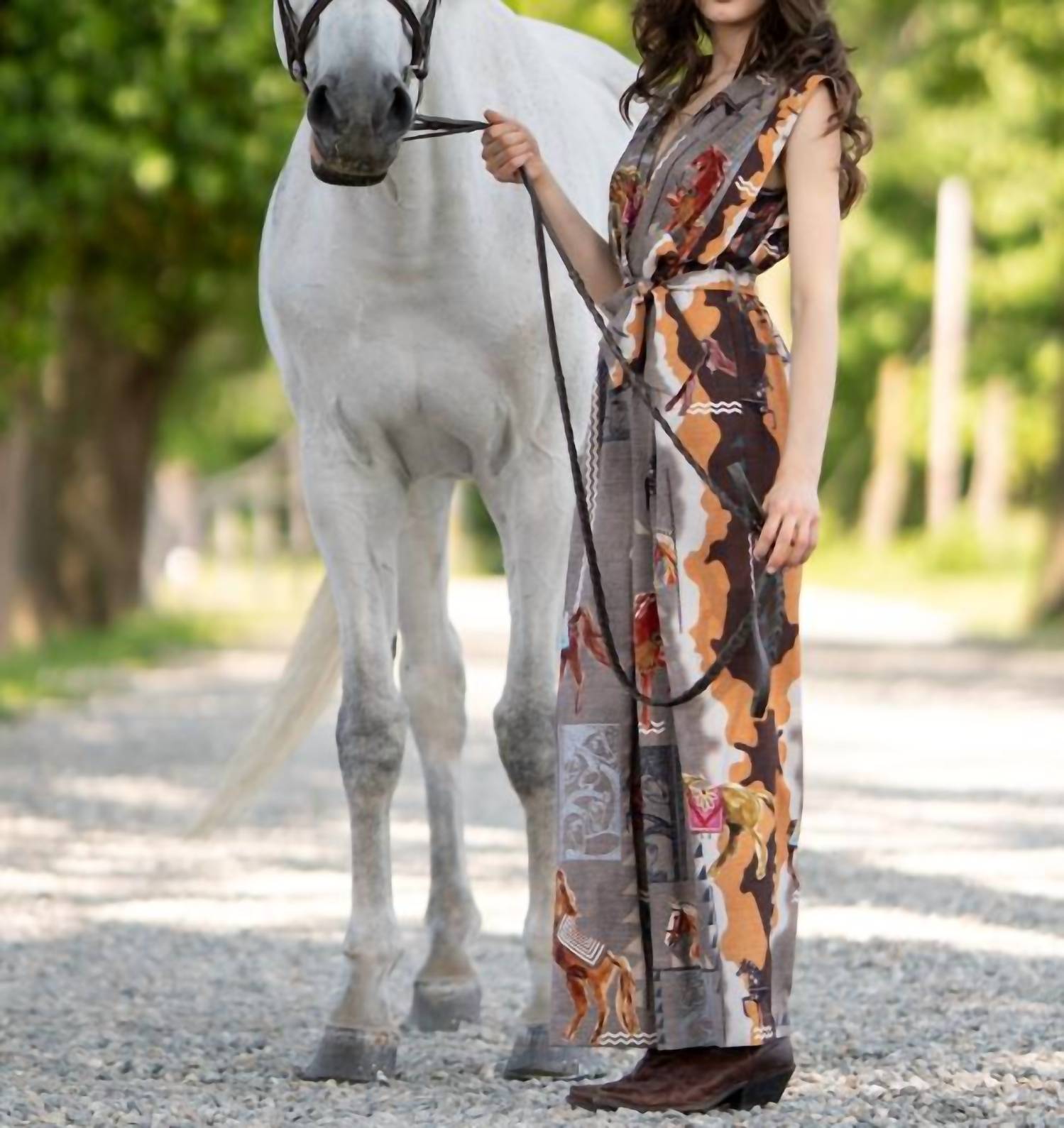 It doesn't take much for this one piece to look effortlessly cool. Add some statement jewelry to dress it up, or throw on some sneakers for a more casual vibe. Introducing Ranna Gill's Mirage Belted Jumpsuit, a stunning piece that blends artistry with fashion. This sleeveless jumpsuit is crafted from a luxurious Crepe blend, featuring a striking multi-color equestrian-inspired print on a warm stone-grey base. The wide-leg silhouette ensures graceful movement, while the high-rise waist is cinched with a matching fabric belt for a flattering fit. Finished with a chic V-neckline and practical side pockets, this piece combines standout printwork with sharp tailoring. Closure: Button. Care: Dry clean only. Ideal for elevating your spring wardrobe, whether at a holiday party or a casual outing.