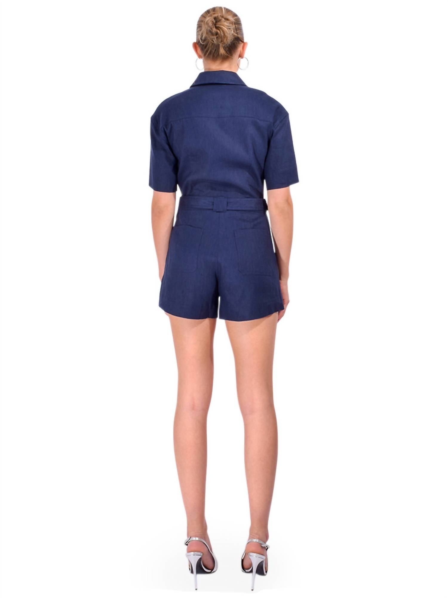 The perfect outfit choice when you you need something quick to throw on and still want to look efforlessly cool. SIMKHAI presents the Aspen Short Sleeve Romper in an elegant Midnight hue, perfectly tailored for a sophisticated yet relaxed style. Crafted in a linen poplin combo, it consists of 51% Linen, 46% Rayon, and 3% Spandex, offering a structured yet comfortable fit. The romper features a cinched waist, straight leg, and convenient pockets, making it an ideal choice for spring dinner parties. Care instructions suggest machine wash for easy maintenance, ensuring lasting wear.
