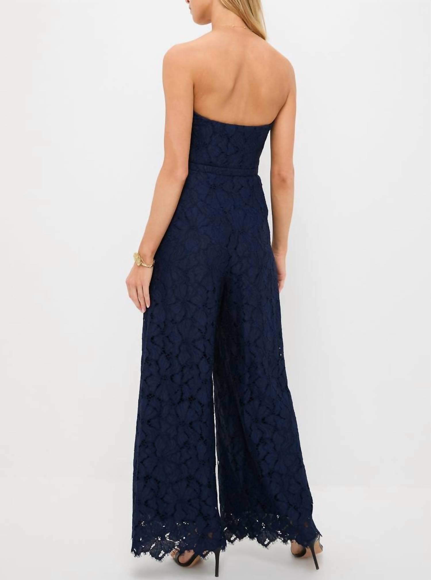 The perfect outfit choice when you you need something quick to throw on and still want to look efforlessly cool. Introducing the Rebecca Jumpsuit by SIMKHAI, a stunning piece in Midnight, perfect for evening events this spring. This strapless jumpsuit features a textured design with a fit and flare silhouette that transitions into a relaxed wide-leg style. Made from recycled polyester, it features a side zipper closure and includes pockets for added practicality. Crafted for the modern woman, this imported piece requires dry cleaning to maintain its structure and swing. Model is 5'10" and wearing a size 2.