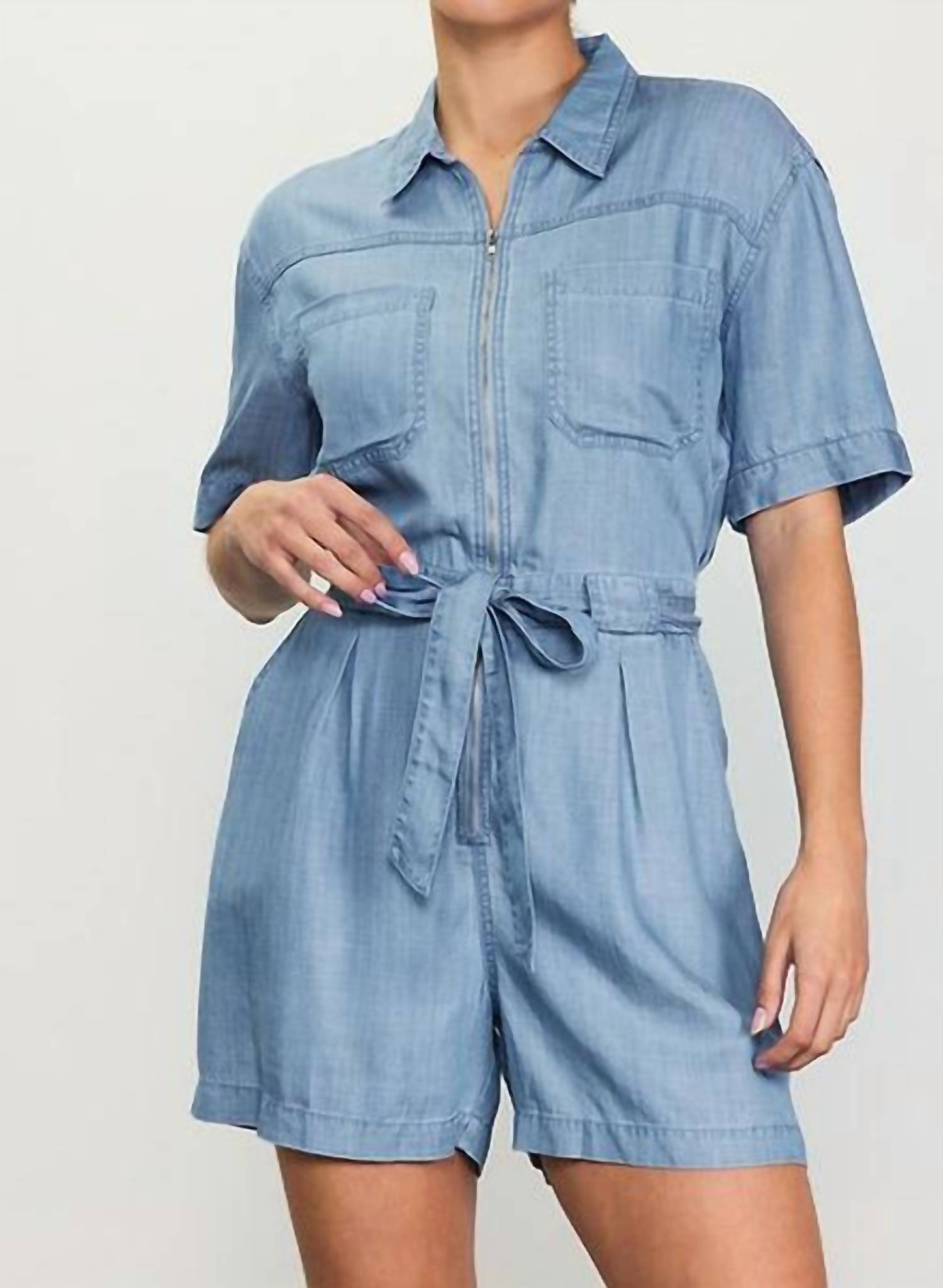 It doesn't take much for this one piece to look effortlessly cool. Add some statement jewelry to dress it up, or throw on some sneakers for a more casual vibe. Unveil effortless style with the Lila Chambray Romper by SKIES ARE BLUE in a chic chambray color. Perfect for casual summer days, this romper features short sleeves, a structured pointed collar, and a convenient front zip closure. Crafted from 100% Lyocell, it boasts a flattering pleated waist with an optional self-tie belt, enhanced by functional patch chest pockets and slant hip pockets. Ideal for travel or daily wear, this lightweight piece embodies 90s fashion trends.