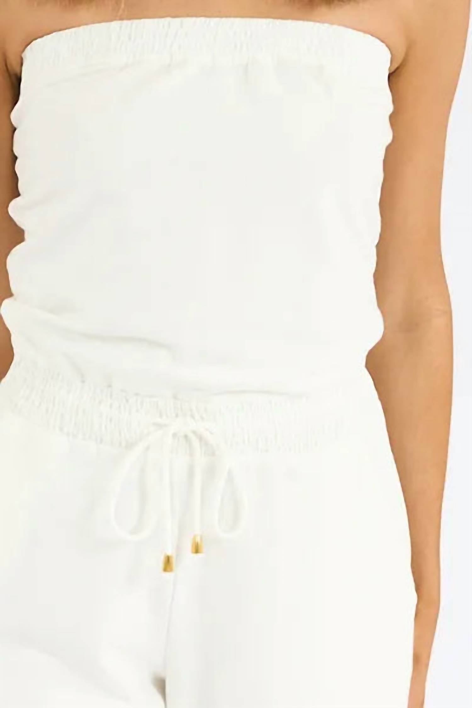 The perfect outfit choice when you you need something quick to throw on and still want to look efforlessly cool. Embrace effortless style this summer with the Francine Jumpsuit by Sundays, an epitome of casual elegance in crisp white. Designed with a high-rise waist and relaxed straight-leg fit, it features a 30.5” inseam and convenient pockets for added ease. Crafted from a Lux Wash French Terry with poplin details, it boasts a composition of 58% Cotton, 37% Polyester, and 5% Spandex. Closure: Pull-on style. Care: Machine wash cold with like colors, tumble dry low. Model is wearing a size XS (5’10” height, 32” bust, 25” waist, 35” hips).
