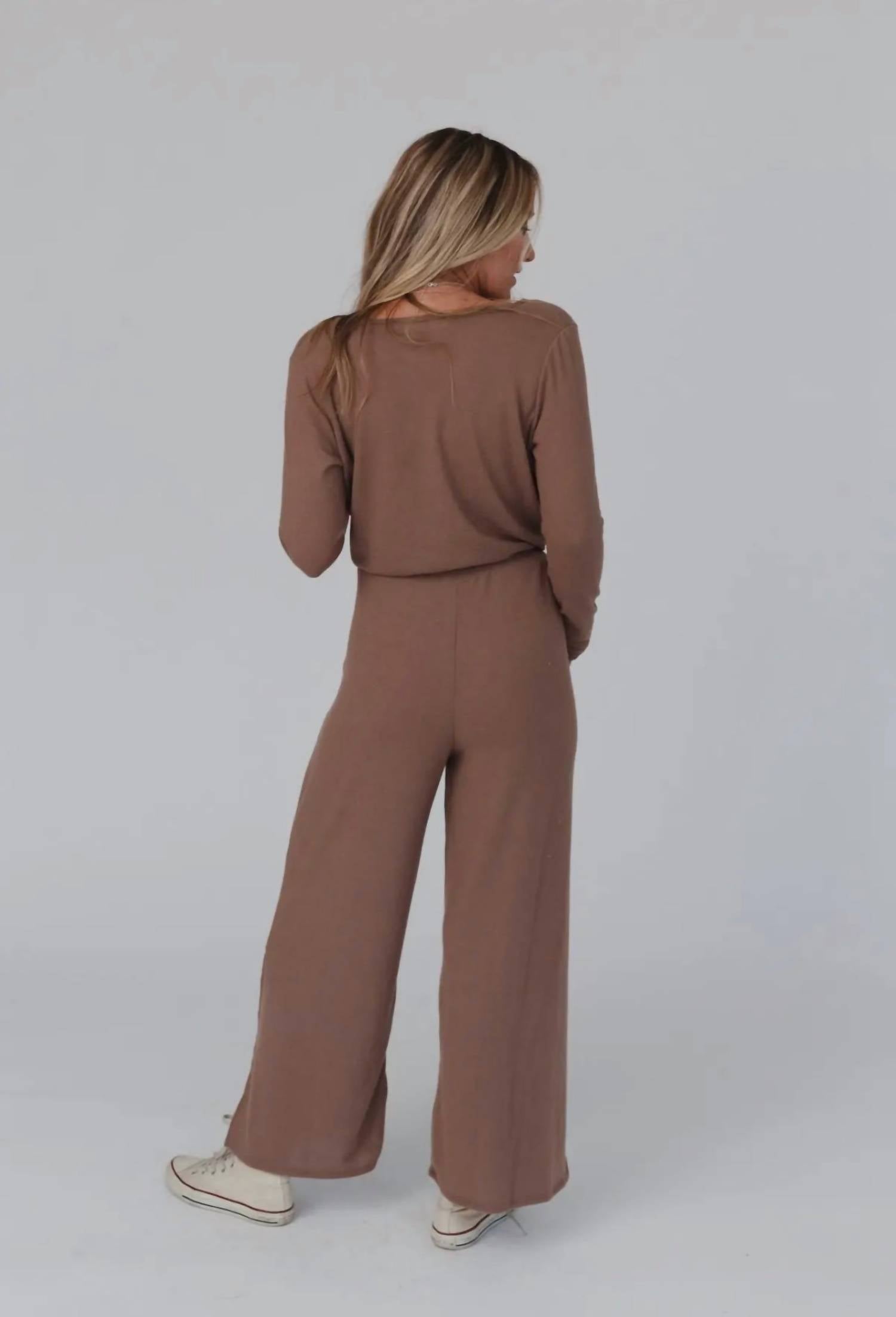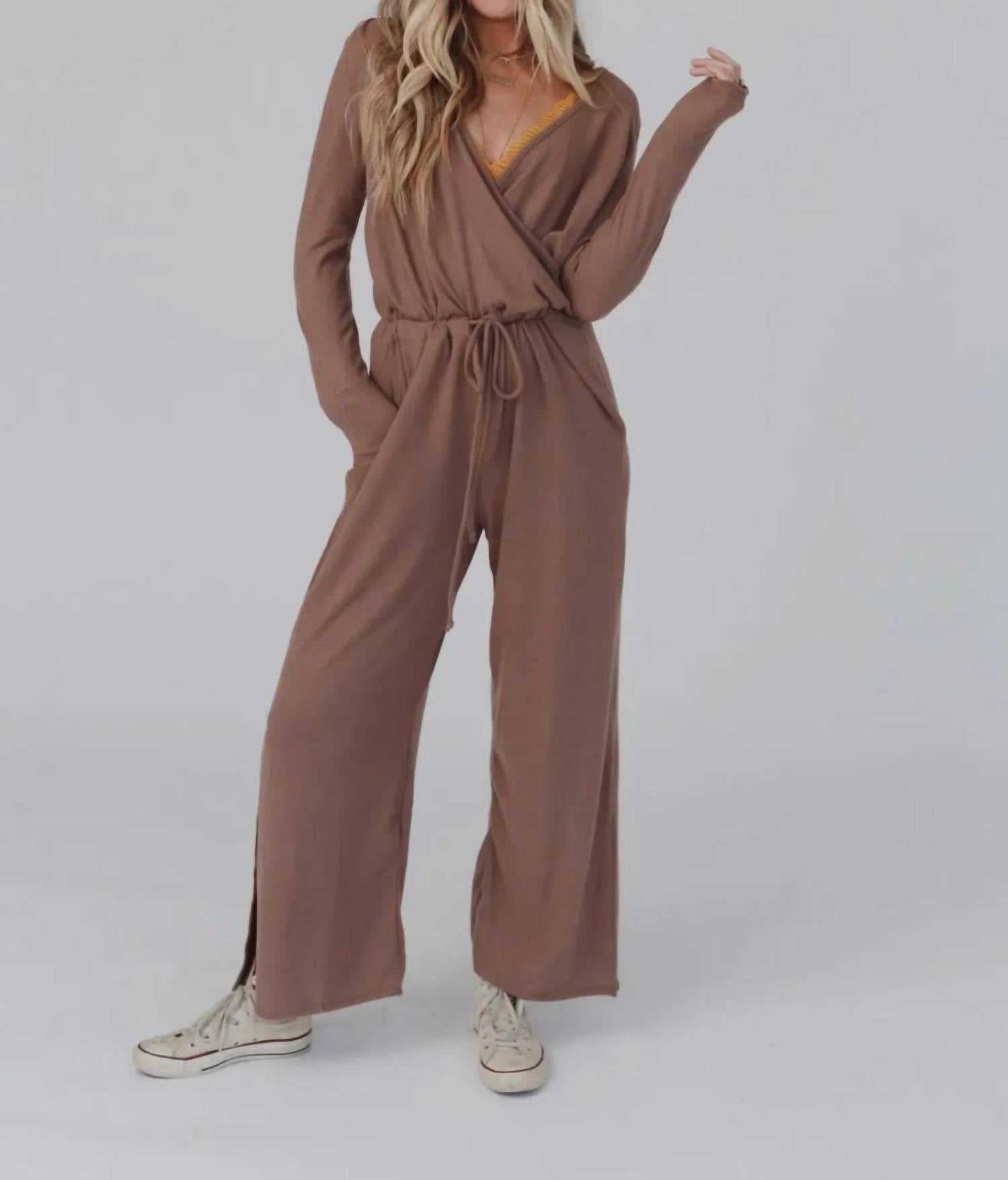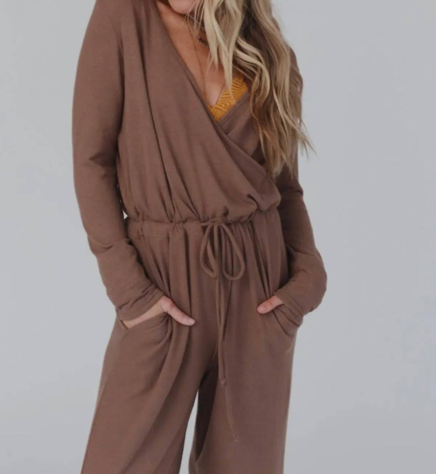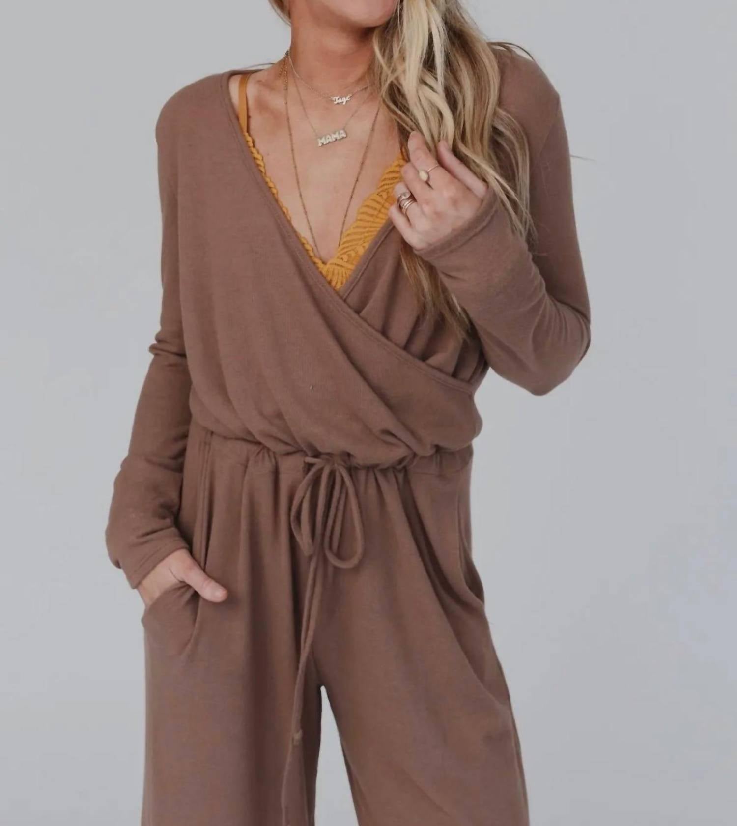 Throw it on and go! Embrace the season's coziness with Three Bird Nest's As It Was Cross Front Jumpsuit, crafted from an ultra-soft and stretchy lightweight knit. Designed for women in a mushroom color, this autumn-ready jumpsuit boasts long sleeves and a high-rise, wide-leg cut for a comfort fit. Made in the USA, it features a convenient pull-on closure and includes pockets for added functionality. Composition: 96% Polyester, 4% Spandex. Care: Hand wash cold, lay flat to dry. With approximate unstretched measurements, the size small has a 40" bust, 27" waist, 50" hip, 58" length, 27.5" inseam, and 24" sleeve length.
