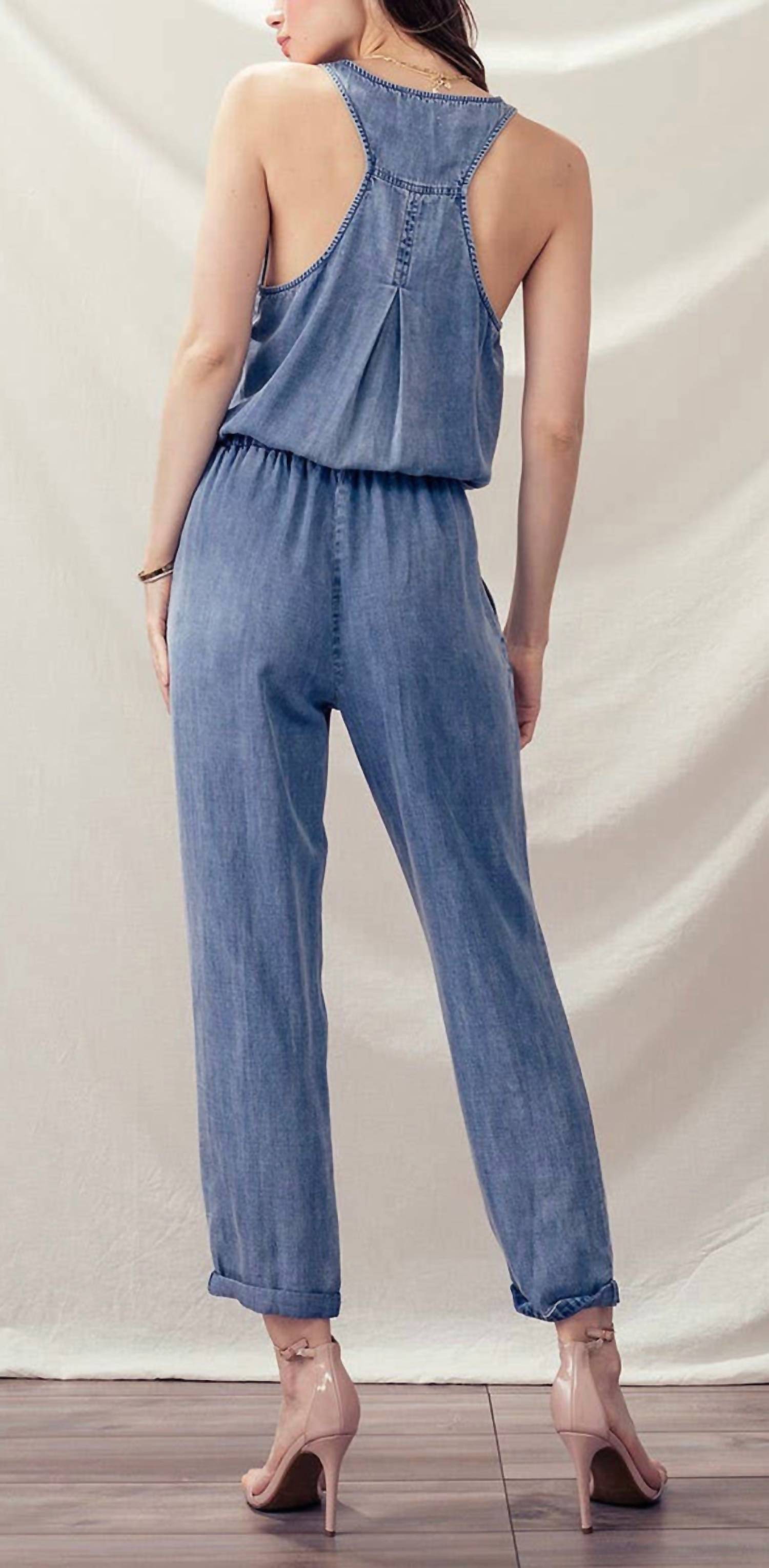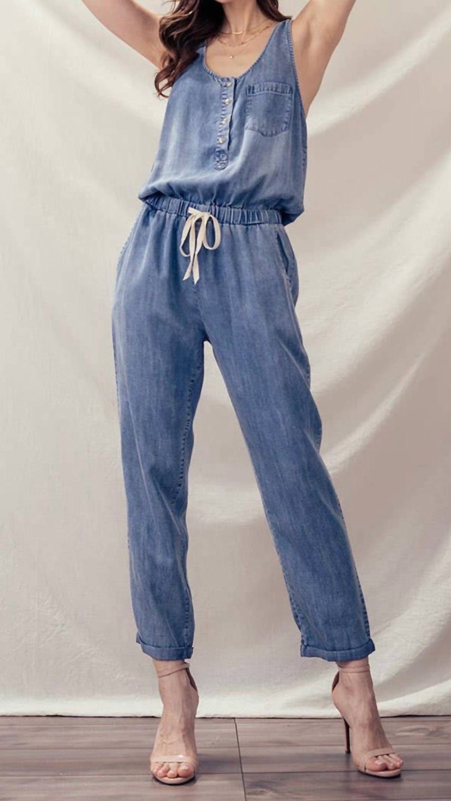 The perfect outfit choice when you you need something quick to throw on and still want to look efforlessly cool. Elevate your summer wardrobe with the Drawstring Sleeveless Jumpsuit by Urban Daizy, showcasing a sleek racer-back design in a trendy denim hue. Crafted from 100% Lyocell, this soft tencel jumpsuit ensures comfort and style in any setting. It features practical pockets and secures with a convenient button closure and tie drawstrings. Care for this standout piece by hand washing and laying flat to dry.