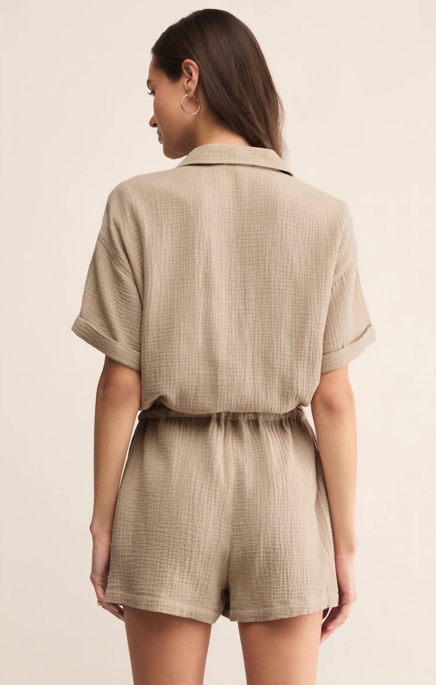 Introducing the Lookout Romper by Z Supply, crafted in a soft, double gauze 100% cotton fabric for ultimate comfort. This women's romper in Putty features a relaxed fit with a collared neckline, wide leg style, and convenient chest pockets. The button closure and separate belt add functionality and style, while the textured fabric adds a trendy touch. Care for this piece is simple: machine wash cold on a delicate cycle, and hang to dry. Inseam: 3 inches.