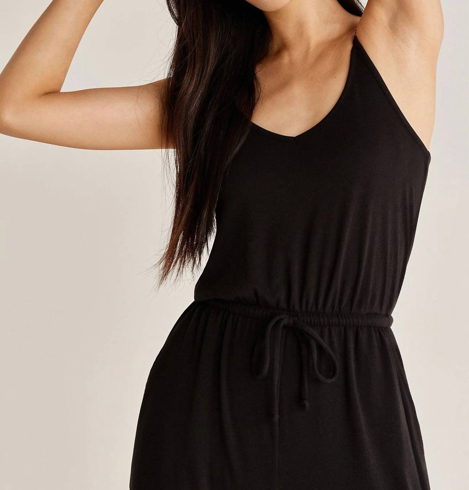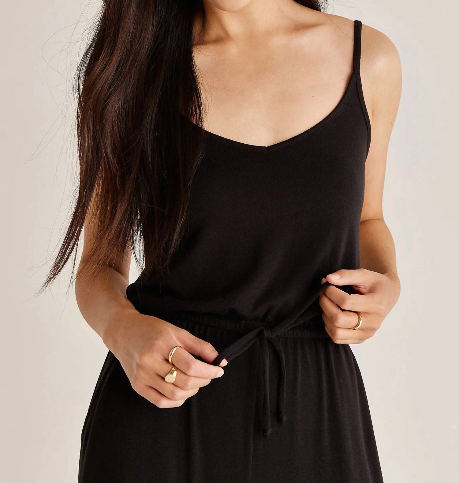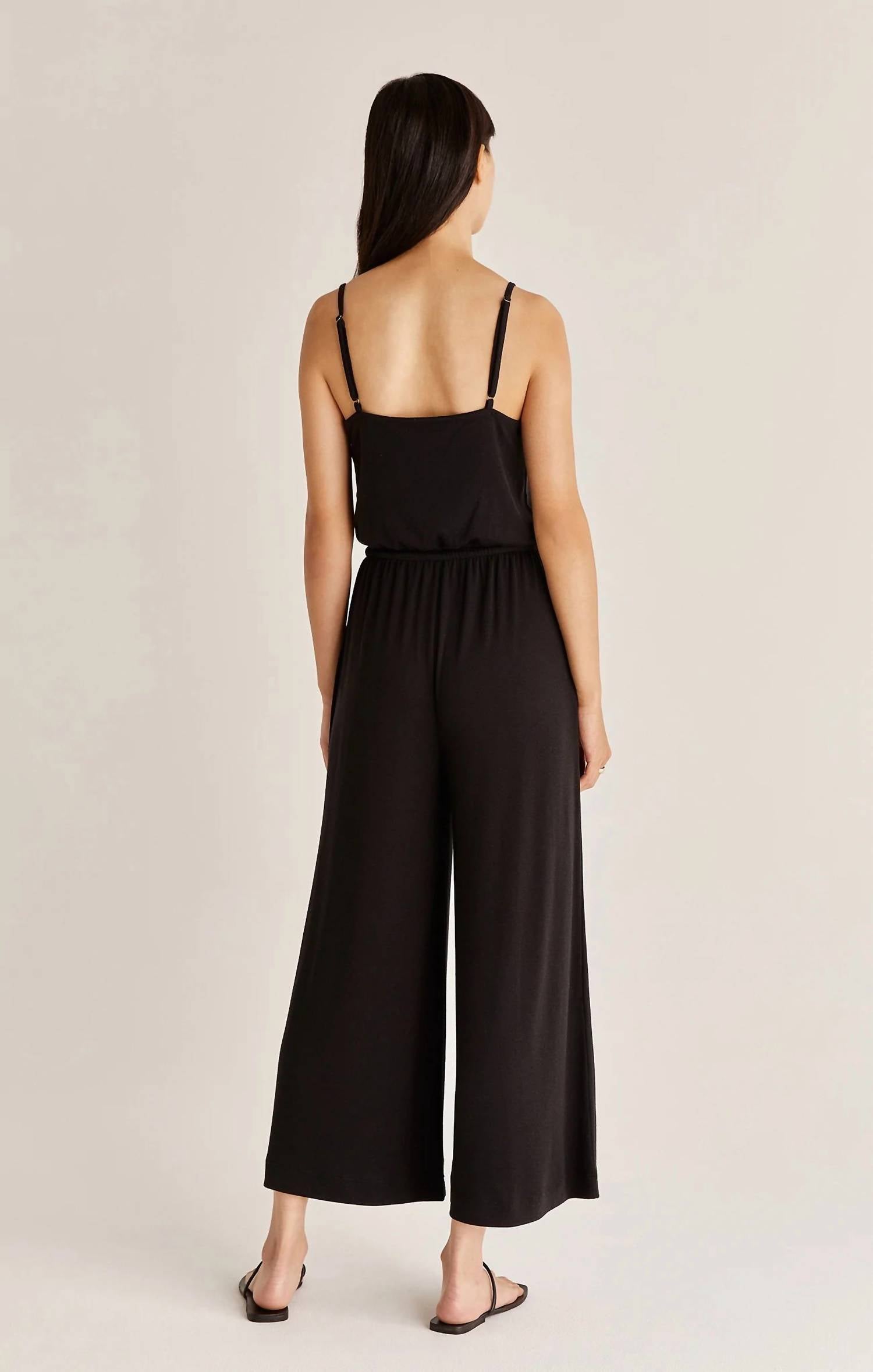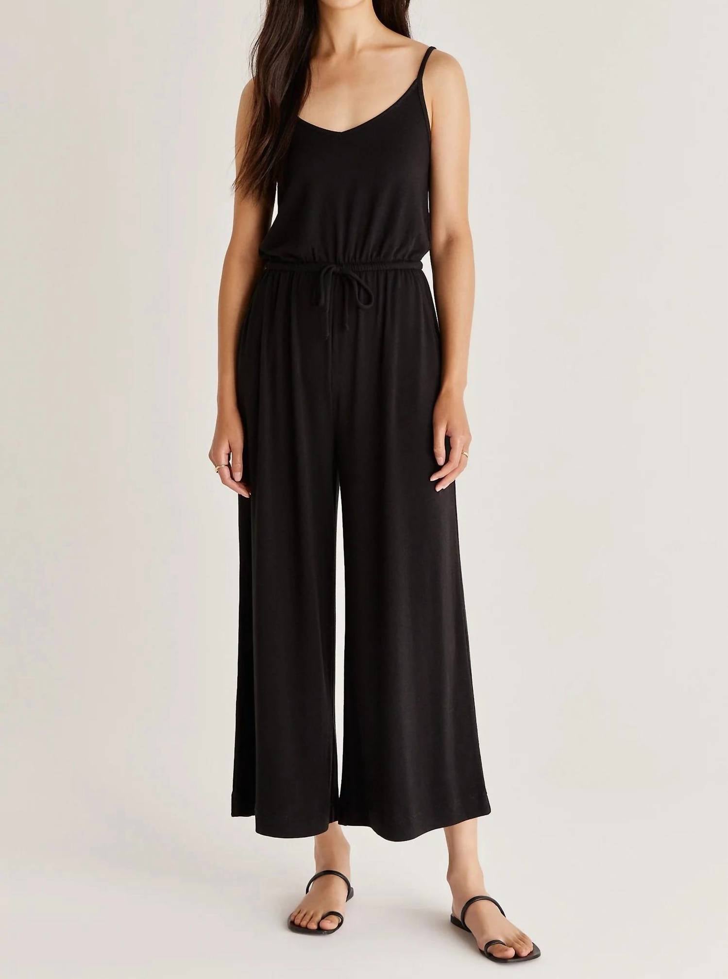 It doesn't take much for this one piece to look effortlessly cool. Add some statement jewelry to dress it up, or throw on some sneakers for a more casual vibe. Discover the Shawn Rib Jumpsuit by Z Supply, an effortlessly chic piece perfect for any occasion. This black jumpsuit features spaghetti straps and a high-waisted design with a relaxed fit and wide legs, making it a versatile and comfortable choice. Crafted from a 1x1 rib fabric composed of 62% Polyester, 33% Rayon, and 5% Spandex, it includes practical pockets and a pull-on closure for easy wear. Care: Machine wash cold on a gentle cycle, wash dark colors separately, avoid bleach, and hang to dry. The piece fits with a stylish boyfriend fit, and the model shown is wearing a size small (5'8.5" height, 32" bust, 24" waist, 35" hips).