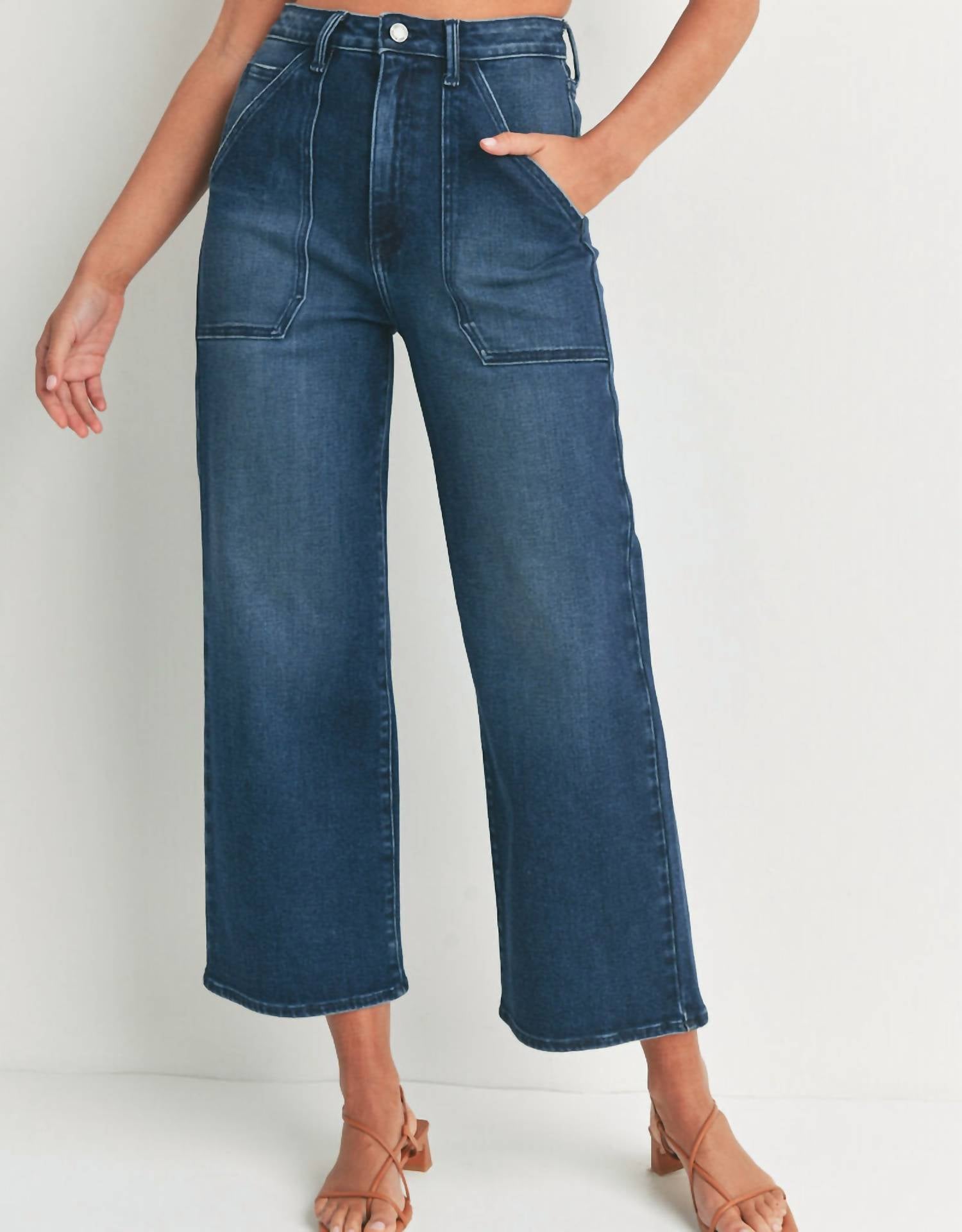 The perfect cropped jean for those transitional seasons. Elevate your wardrobe with the Cargo Pocket Cropped Jeans by JUST BLACK DENIM, featuring a stylish dark wash and high rise design. Perfectly fitted at the hip, these jeans feature a comfortable 12” rise and 27” inseam that creates an effortlessly flattering silhouette. Crafted in the US, they boast a utility cargo pocket and a wide-leg fit, made from 93% Cotton, 5% Polyester, and 2% Spandex. The zip closure completes the relaxed fit, while care is easy with machine wash and tumble dry instructions.