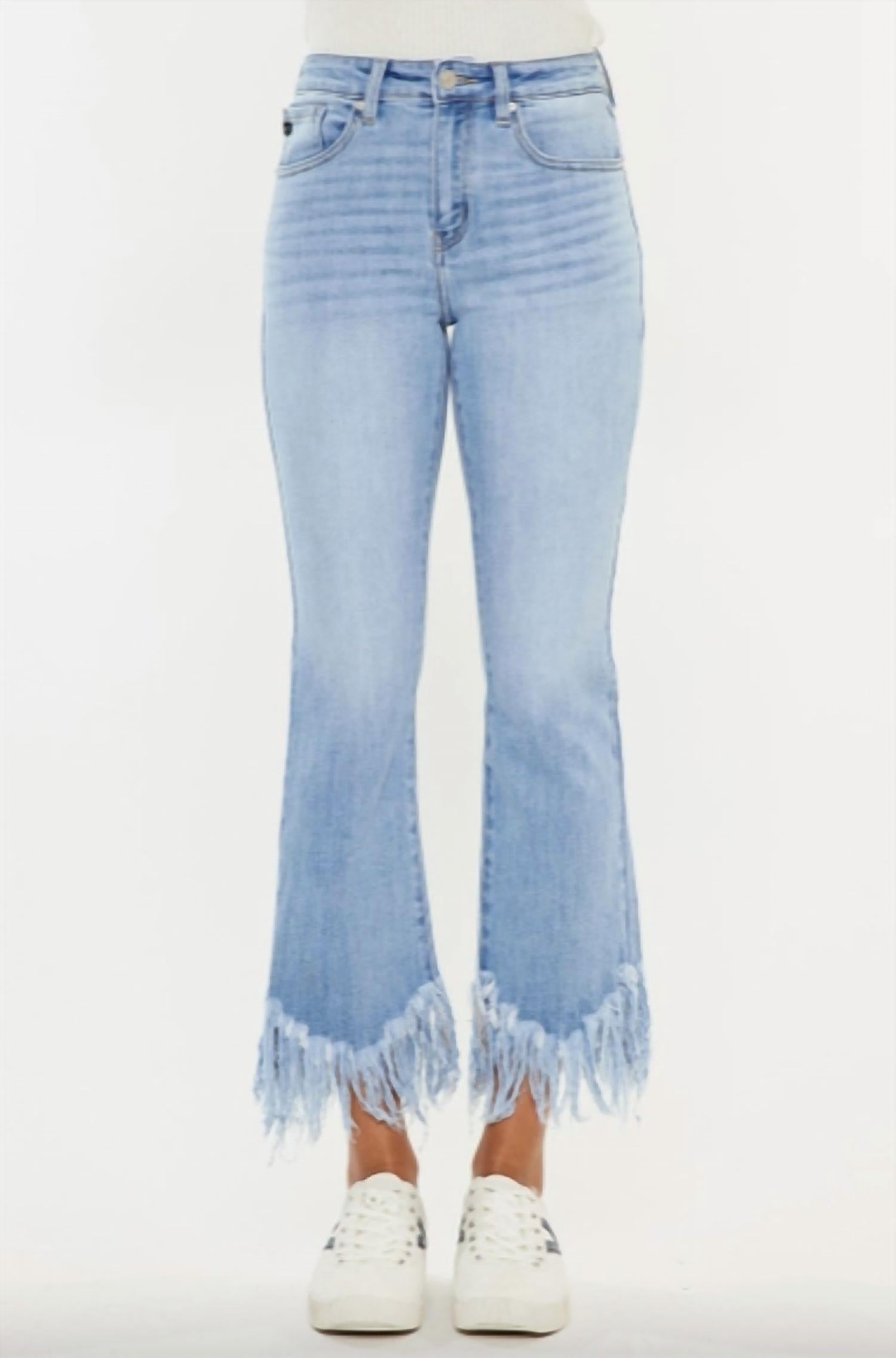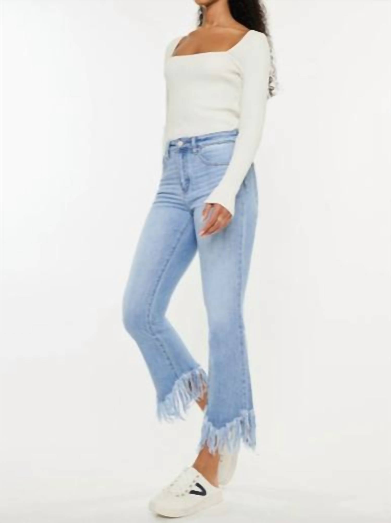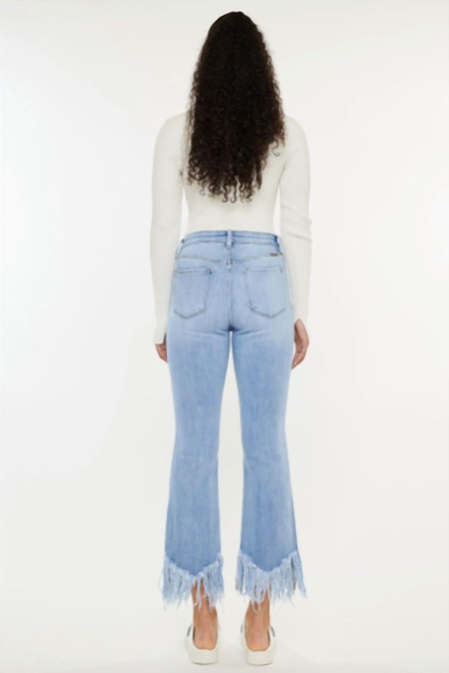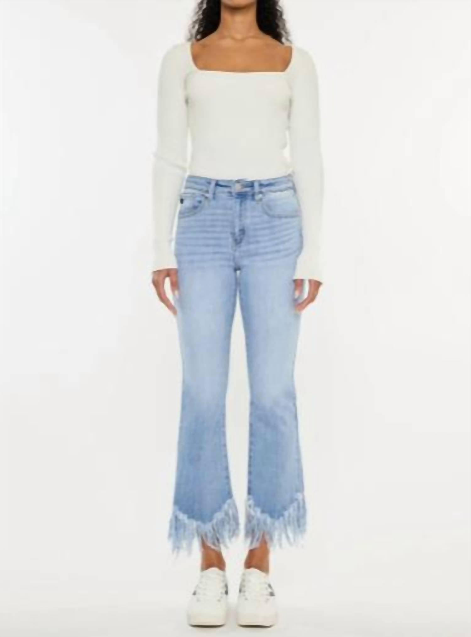 If you're looking for boot-cut, this is the jean for you. Showcasing the High Rise Crop Bootcut Jeans by KanCan, these streetwear-inspired jeans blend a contemporary edge with classic appeal. Crafted from a cotton blend, these medium wash jeans feature a high-rise fit with a 10-inch front rise and a 26-inch inseam. The design includes a unique long fringe hem and a five-pocket style, complete with a zip closure and one button for secure wear. Easy to care for, simply machine wash and tumble dry to maintain their trendy look.