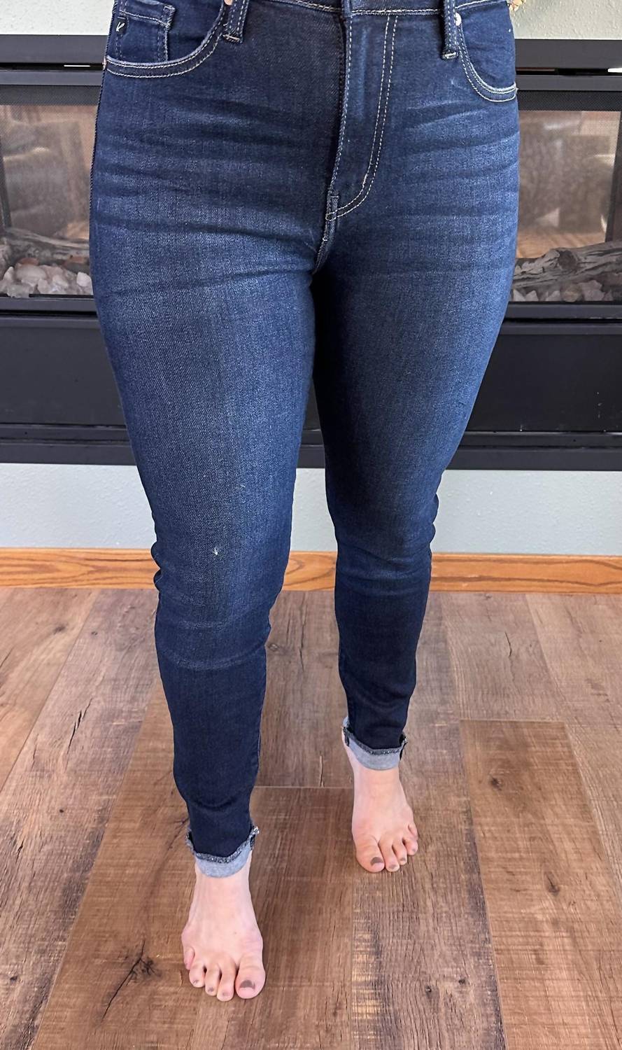 High-waist is here to stay and we especially love this style. Elevate your denim collection with the Janice High Rise Cigarette Leg Jeans by KanCan, designed for a sleek and polished look in classic blue. These jeans feature a high rise with a comfortable stretch and a cuff hem, ensuring both style and ease of movement. Made from a cotton blend, comprising 92.7% cotton, 5.7% polyester, and 1.6% spandex, these jeans offer durability and a slim fit. Closure: Zip closure. Ideal for fall, the dark wash and solid pattern make them suitable for both workwear and church occasions. Model size 5.