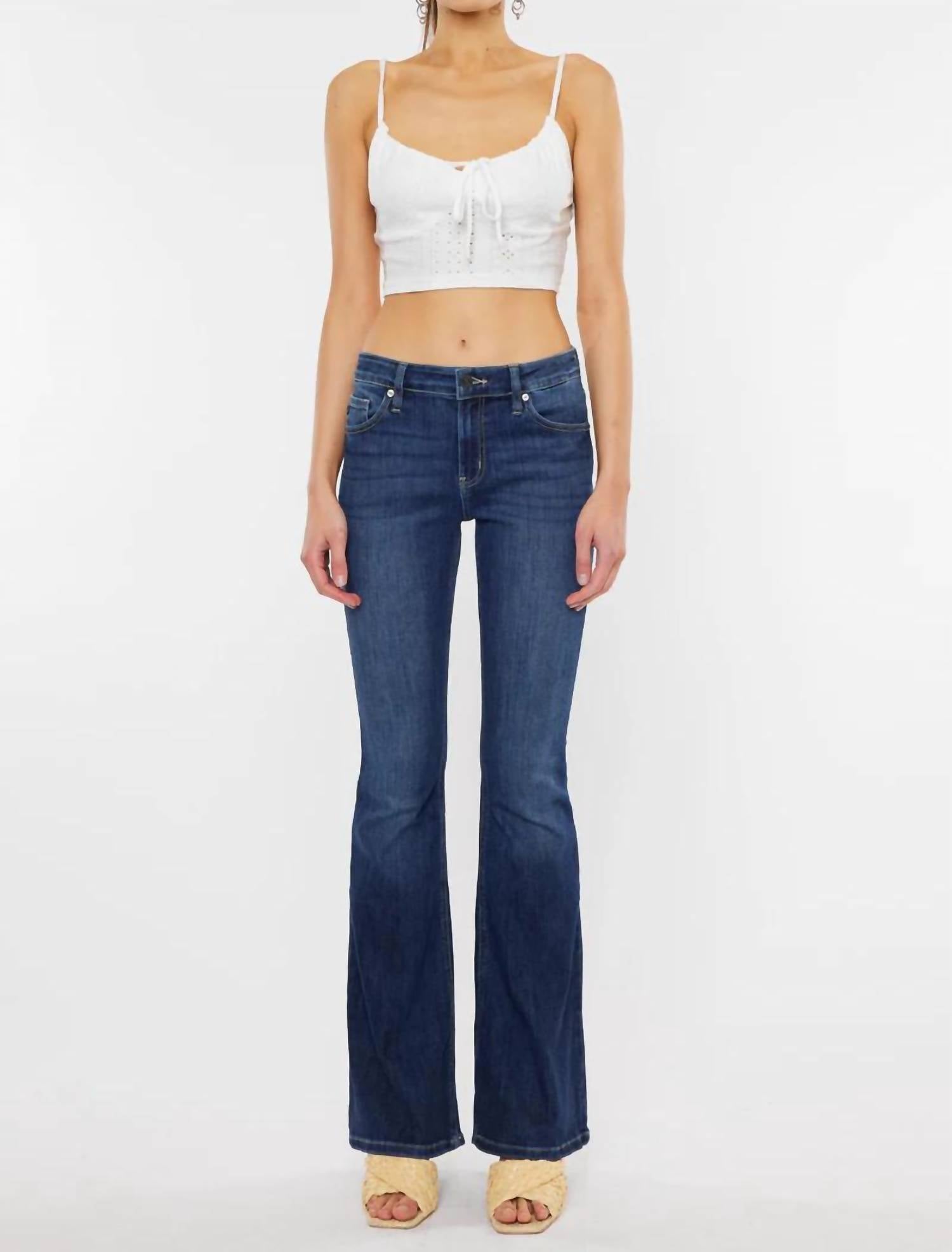 Introducing the KanCan Mid Rise Flare Jean in a classic medium wash, crafted from a soft and stretchy blend of 68% Cotton, 30% Polyester, and 2% Spandex. This timeless piece features a mid-rise waist, flared leg design, and measures a 9.25" rise with a 33.75" inseam in size 25. It includes a traditional five-pocket design and is secured with a single-button front paired with a zip-fly closure. For added convenience, simply machine wash and tumble dry to care for these jeans.