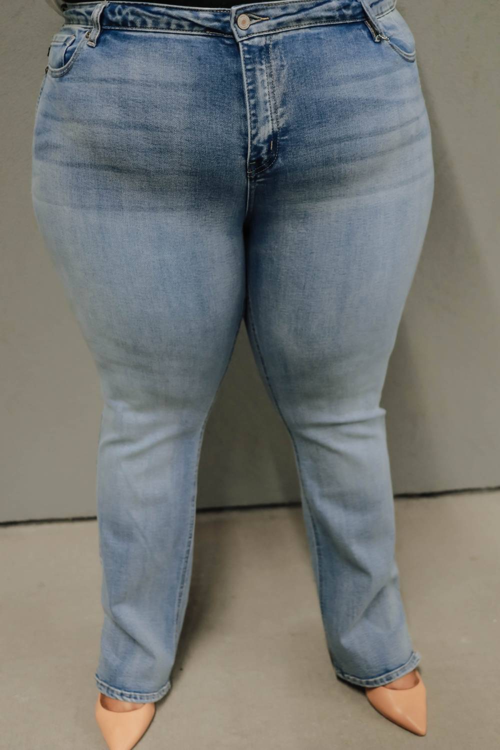A boot-cut jean that not only looks good on, you'll be comfortable in them all day. Introducing the Plus Size Savannah Bootcut Jeans Curvy by KanCan, crafted for optimal comfort and style. These solid blue denim jeans feature a high rise and a bootcut leg style with a modern side slit, making them perfect for versatile wear. With a button closure, they boast great stretch and a medium wash that embodies the latest 90s fashion trend. Care instructions: Machine wash. Model is 5'8" wearing size 22W with an inseam of 32.5 inches.