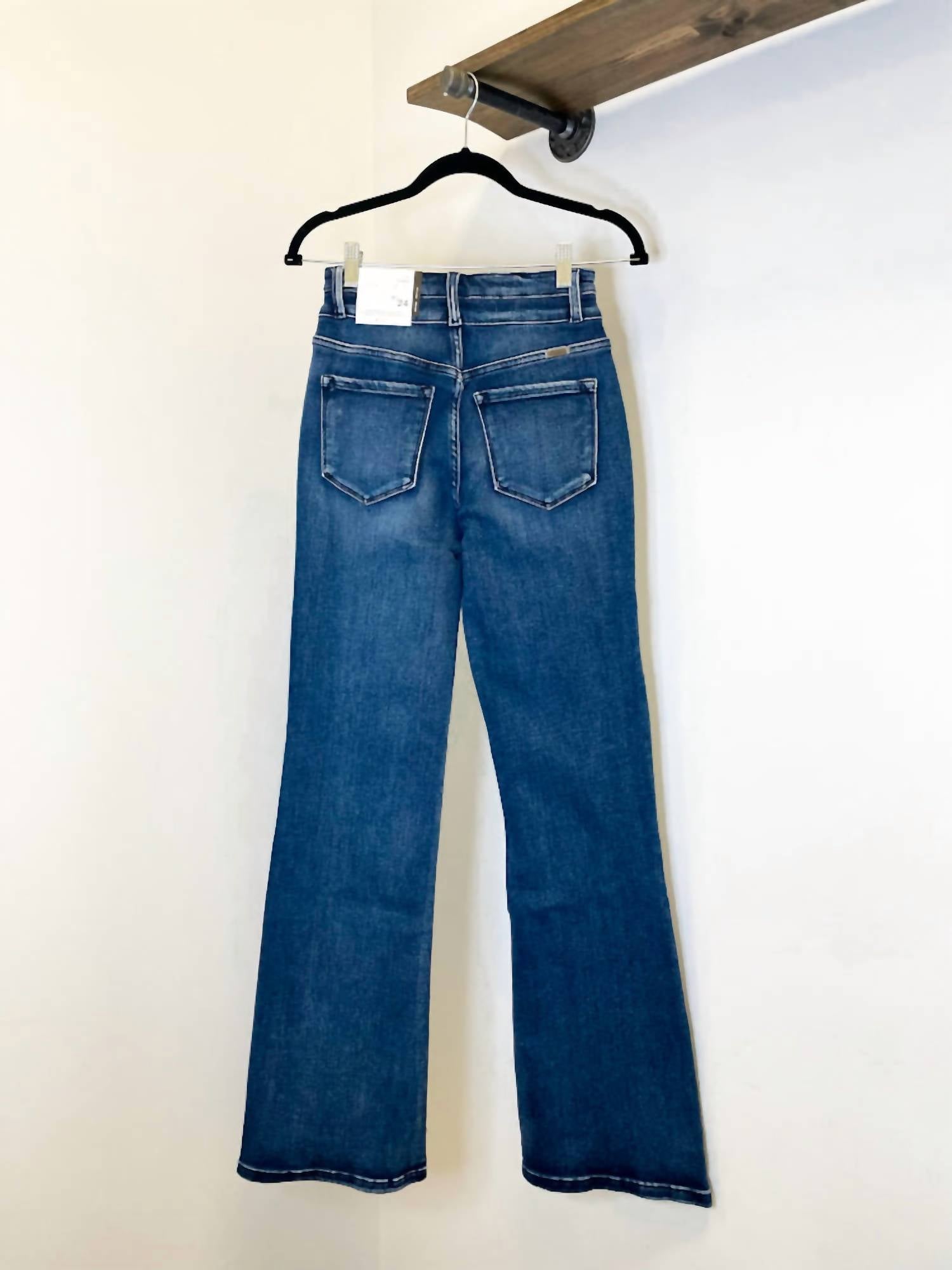 A boot-cut jean that not only looks good on, you'll be comfortable in them all day. Sleek choice in dark wash designed to highlight your silhouette. Crafted from a blend of 75% Cotton, 23% Tencel, and 2% Spandex. Ultra high rise jeans feature a flattering bootcut leg style. Boast an 11" rise and a 34" inseam. Complete with a double waistband and button closure for added elegance and practicality. Machine wash and tumble dry instructions, ensuring ease in maintenance.