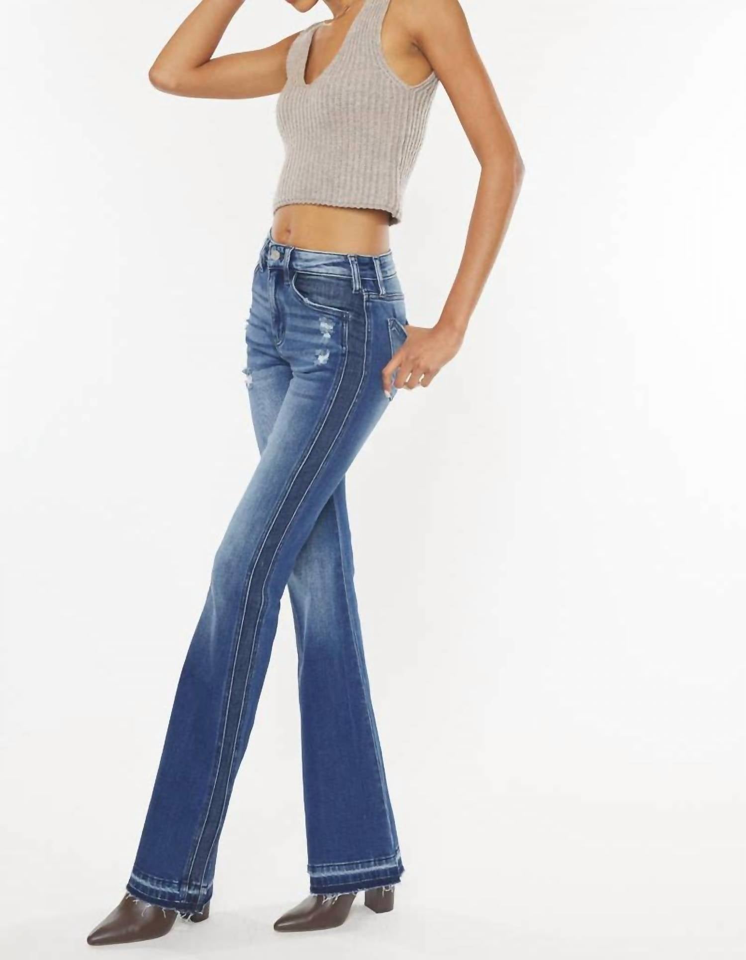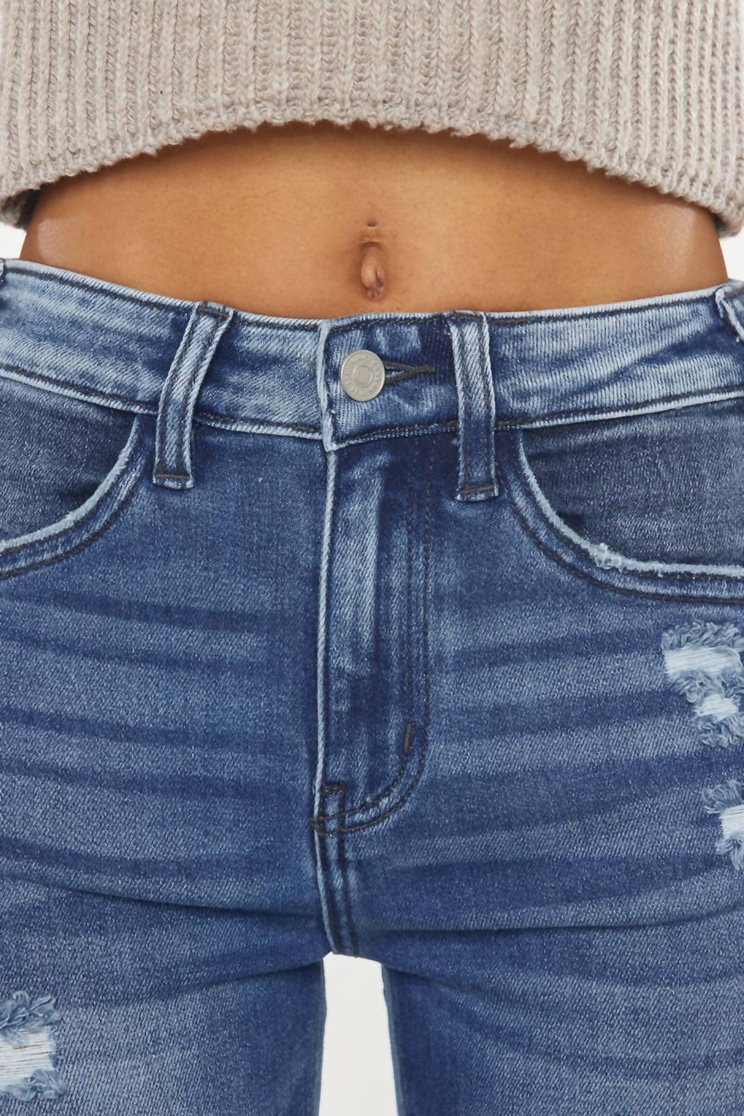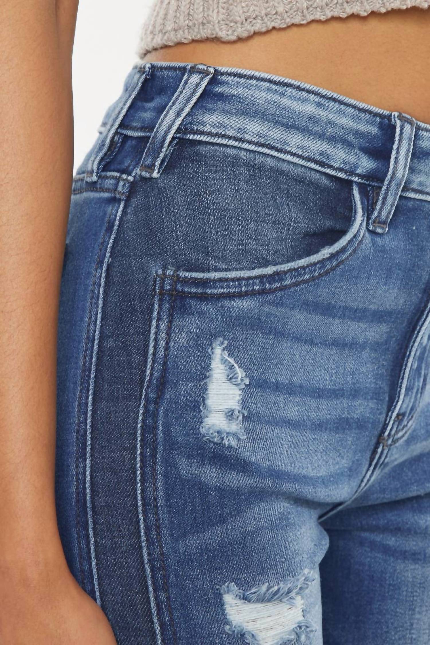 Pair these wide leg jeans with mules, slides or your favorite strappy sandals. Introducing the KanCan Dark Wash High Rise Distressed Flare Jeans, a perfect blend of style and comfort for women seeking a classic fit. These stylish jeans feature a high-rise waist, a 10-inch rise, and a 34-inch inseam, making them ideal for pairing with heels. Crafted from 93% Cotton, 5% Polyester, and 2% Spandex, the jeans boast a solid dark pattern with a contrasting stripe down each leg, adding a unique touch. The zip closure and raw edge bottom enhance their modern appeal, ensuring you step out in confidence.