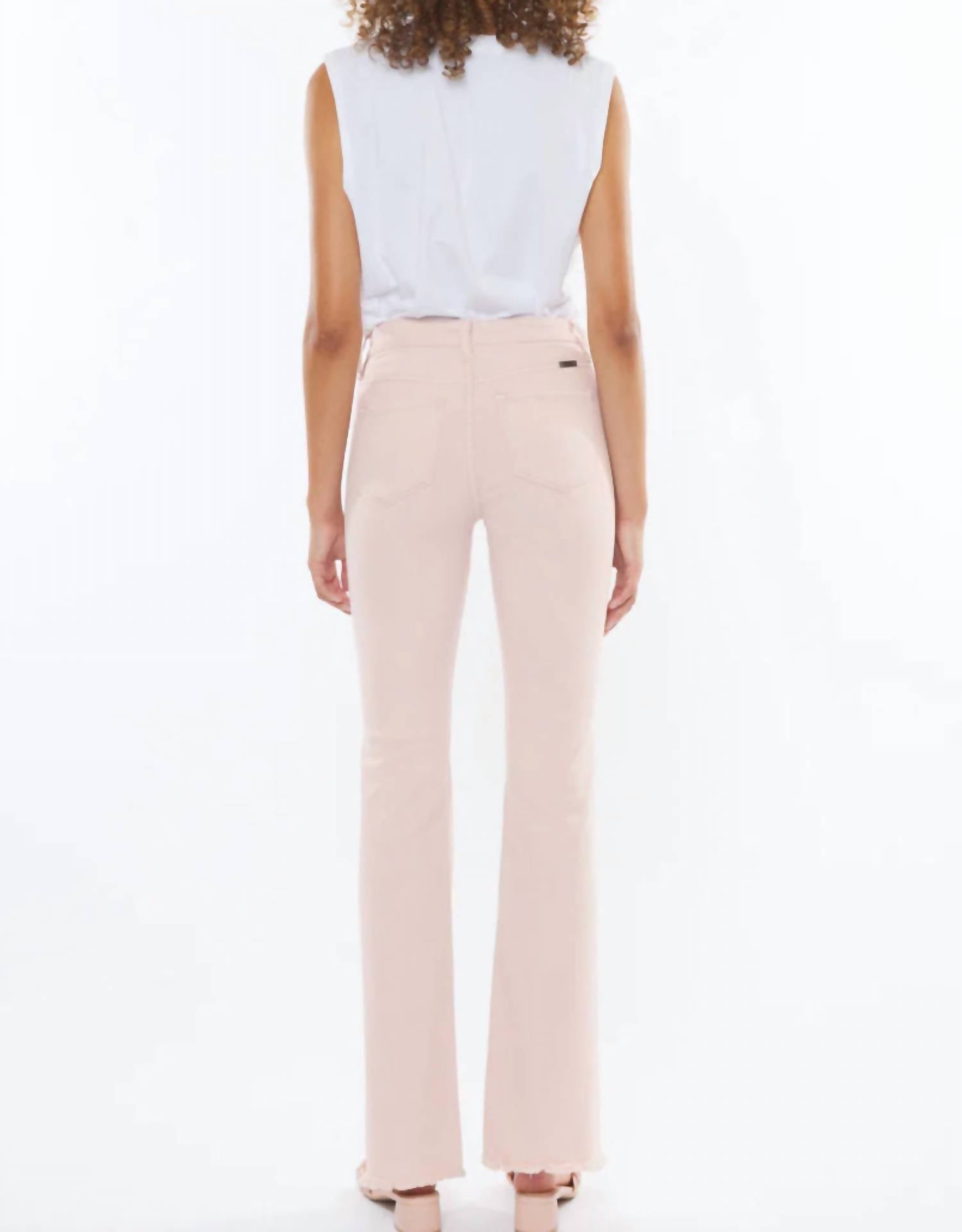 Fit to perfection, we love these high-waist jeans and you will too. Introducing the Ricola High Rise Flare Jean from the KanCan Collection, a chic statement piece in a light pink wash that embodies retro charm. Designed with a 10-inch rise and 32-inch inseam, these jeans sit above the natural waistline with a flattering fit through the hips and thighs, flaring at the knee for a leg-lengthening effect. Crafted from an 87.4% cotton, 9.6% T-400, and 3% spandex blend, they offer both durability and flexibility, ensuring they won't loosen even with frequent wear. The five-pocket style features a distinctive no-stitch frayed hem and a five-button closure for a fashionable finish. Care is simple with machine wash and tumble dry instructions.