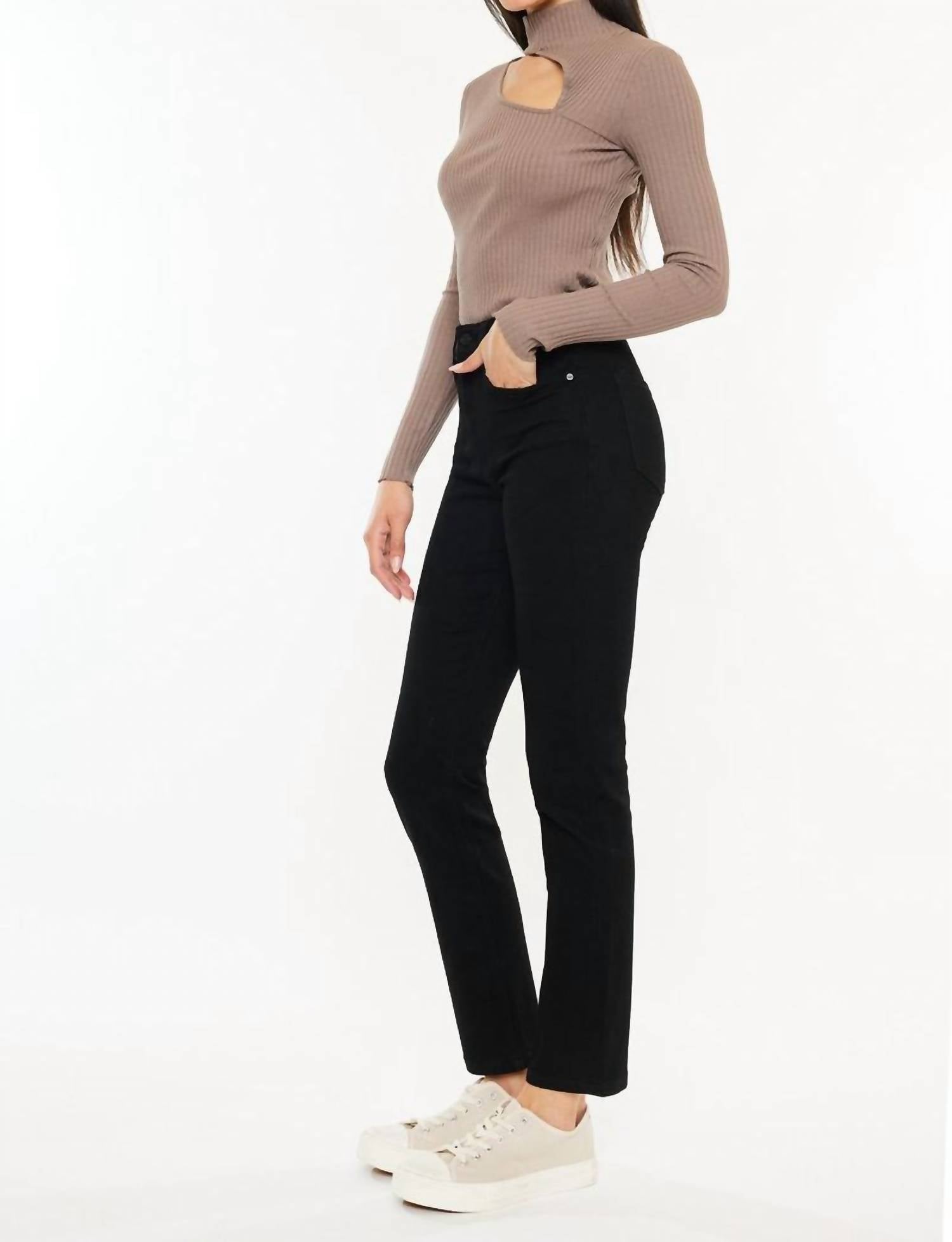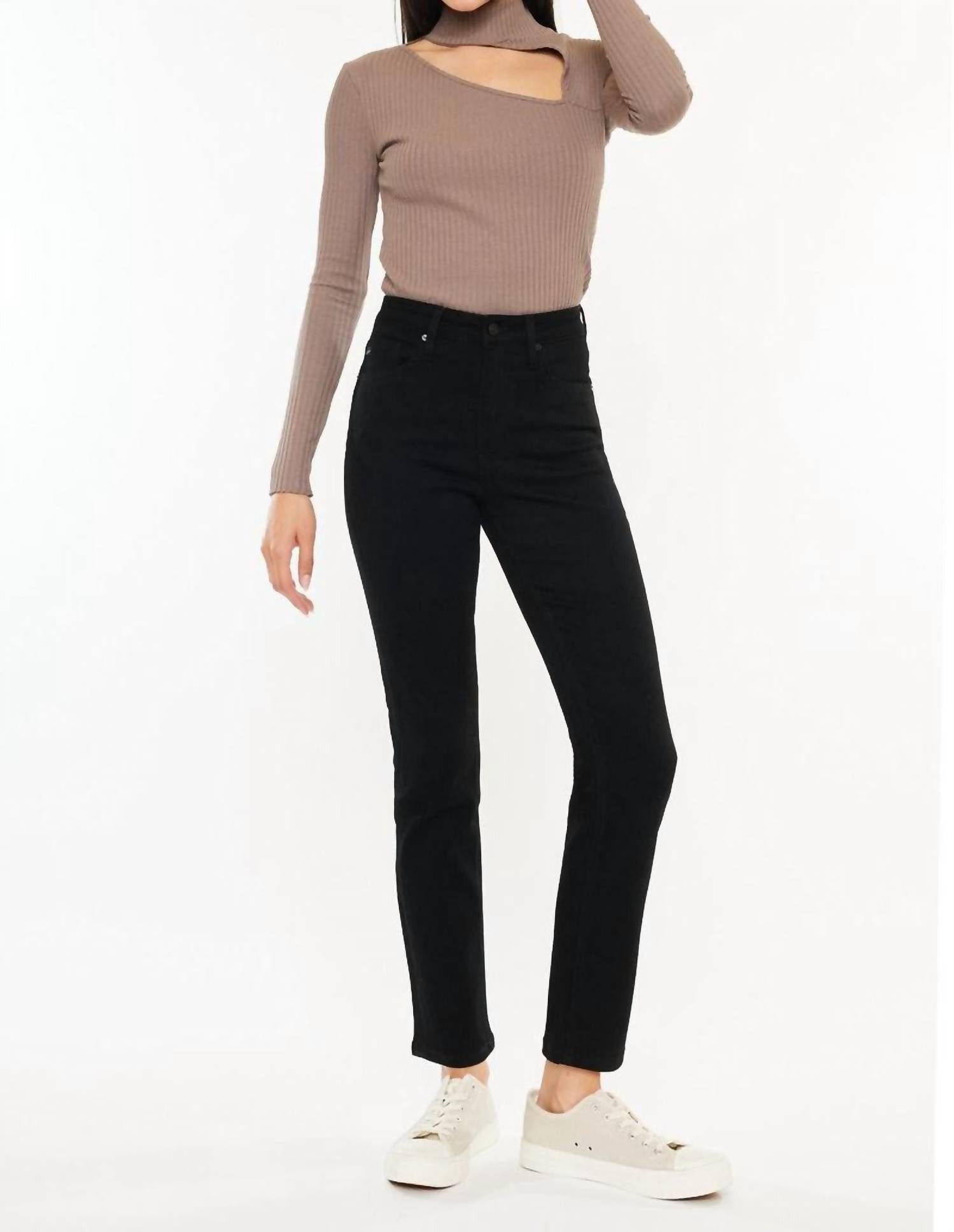 These must-have jeans are fit to perfection. Experience effortless style with the Women's Slim Straight Jean by KanCan, crafted from durable denim in a chic monochrome black. Featuring a sleek slim fit and straight leg silhouette, these jeans boast a flattering mid-rise and a practical zip closure. Designed with a solid pattern, they are perfect for vacations or a spring outing, offering versatile pairings with your favorite tops. Though specific care instructions are not listed, the sturdy construction ensures lasting wear.