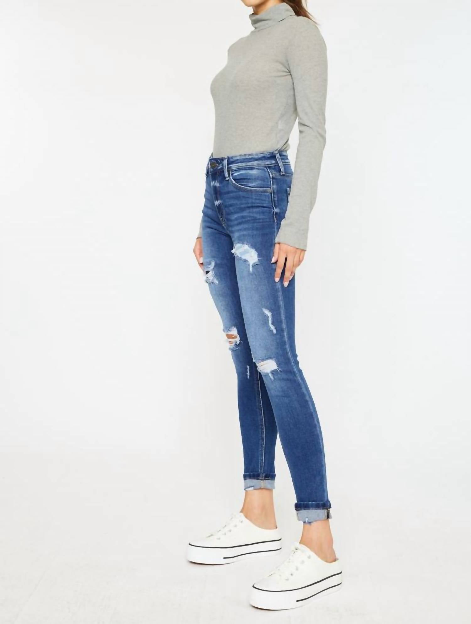 A skinny jean that is both flatering and comfortable. We love this style because it works great with boots, or without! HIGH RISE ANKLE SKINNY JEANS MEDIUM STONE WASH COMFORT STRETCH DISTRESSED WITH PATCH ZIPPER FLY 5 POCKET SINGLE CUFF WITH DESTRUCTION RISE 10", INSEAM 27 1/2" (W 1 1/2" SINGLE FOLD) IN SIZE 5/26 93% COTTON, 5% POLYESTER, 2% SPANDEX 11.5 OZ