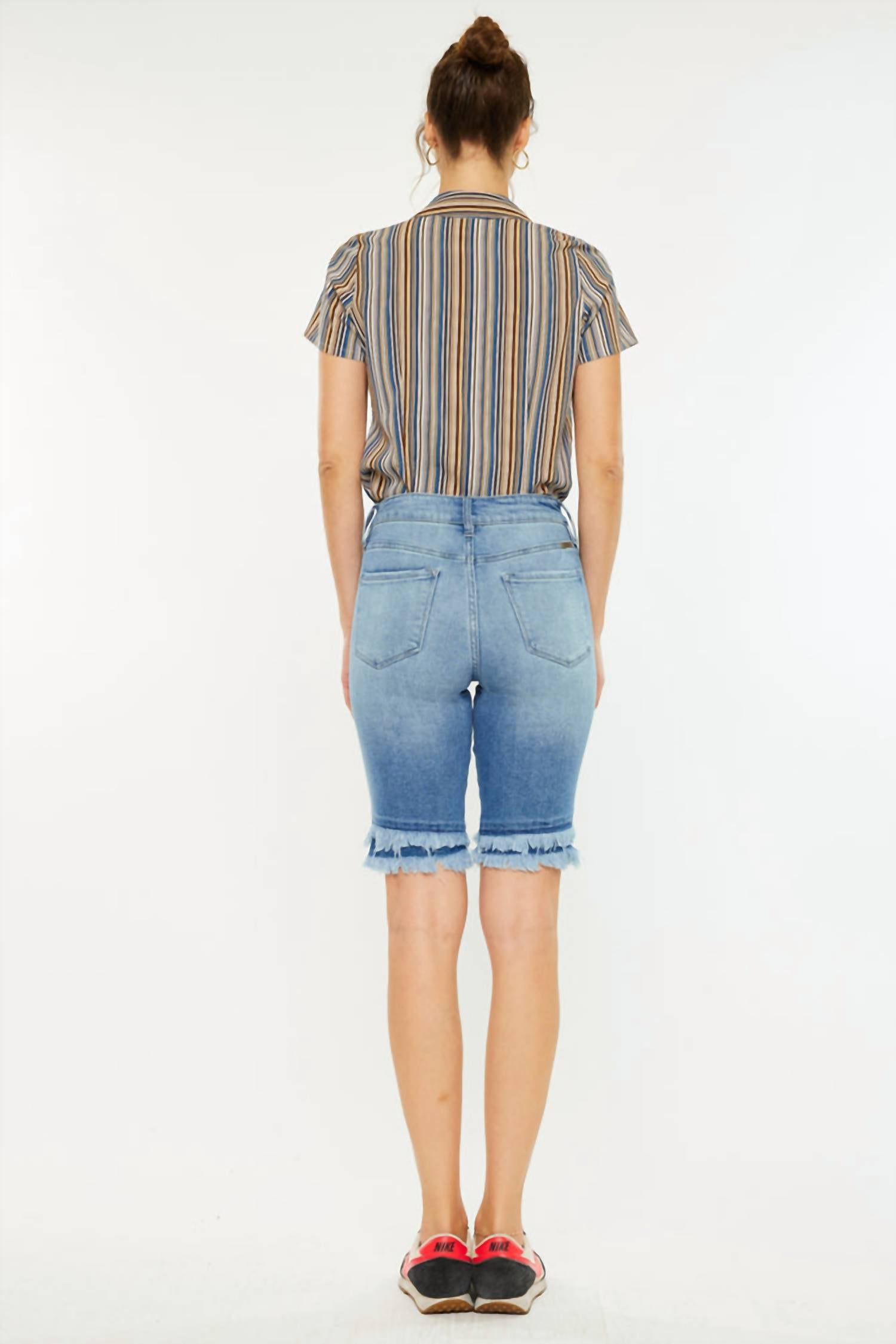 A preppy and feminine take on the classic bermuda short. Comfortable enough to lounge in and cute enough to wear out during your next warm weather outing. Meet the KanCan High-rise Bermuda Shorts in a medium wash, a blend of comfort and style for your summer wardrobe. Crafted from textured denim, these shorts feature an 11-inch inseam and a functional zip closure, making them a versatile choice for relaxed outings. Designed with practicality in mind, they include pockets to conveniently store essentials. Care: Machine wash to maintain the lively spirit of these quintessential warm-weather Bermudas.